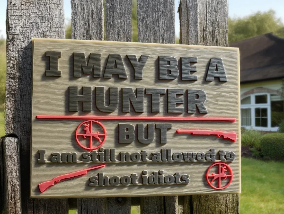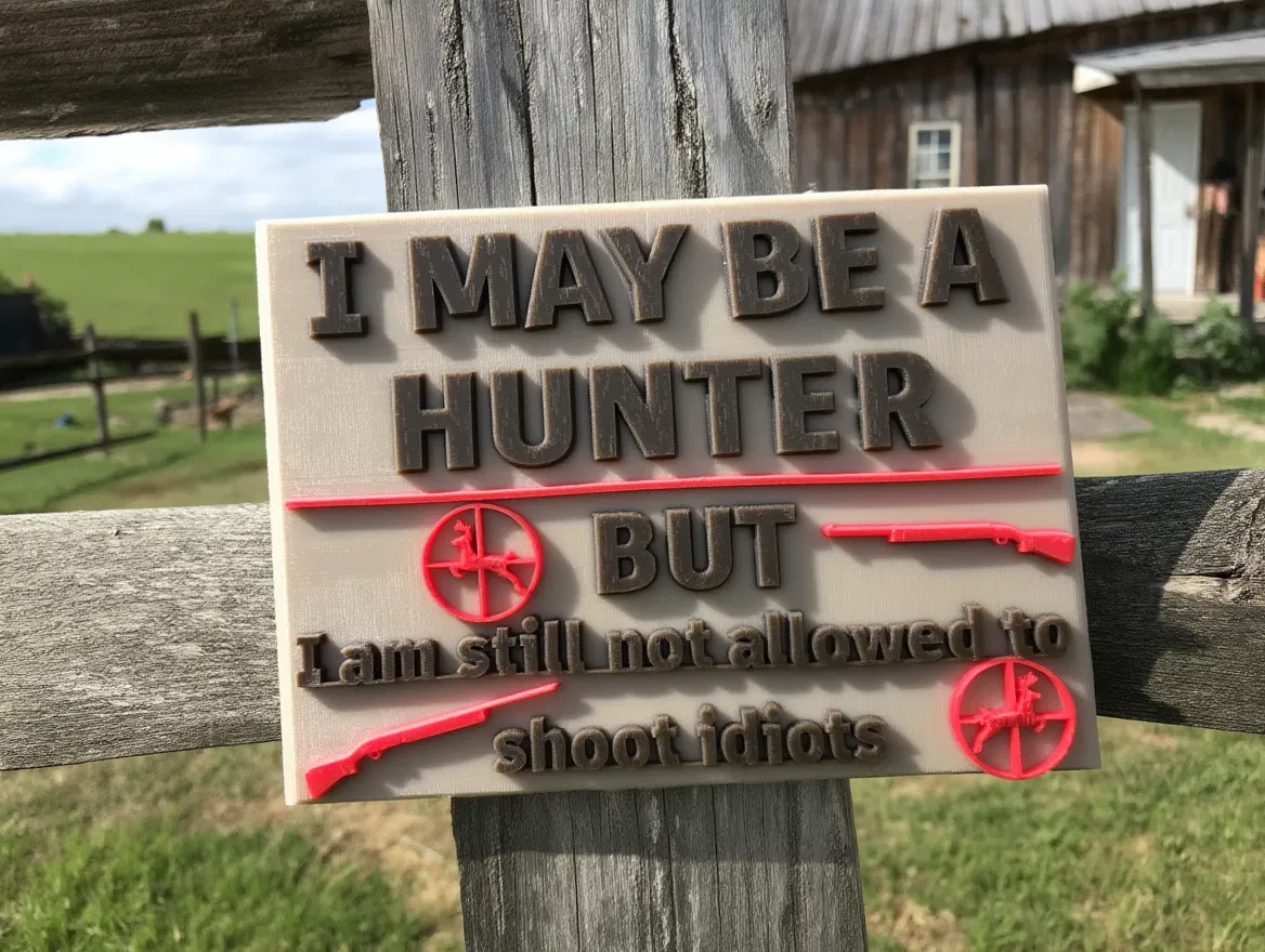 Bảng hiệu “Licensed to Hunt… Not to Shoot Idiots” in 3D với chữ nổi nổi bật và họa tiết săn bắn hài hước. Dễ in trên máy FDM, treo hợp ở cabin, workshop, garage hay man cave; làm quà tặng cũng rất vui.