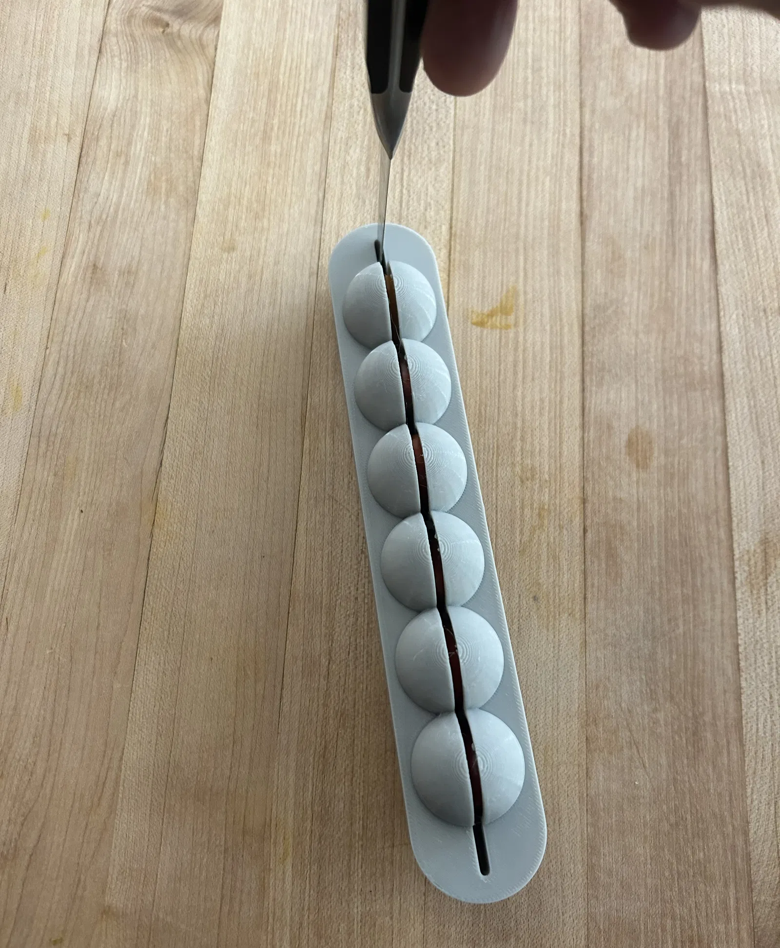 Khuôn/dụng cụ hỗ trợ cắt lát cà chua bi (hoặc các loại trái nhỏ khác) gọn và đều. Phù hợp để chuẩn bị salad nhanh, dễ in 3D và tiện dùng trong bếp.