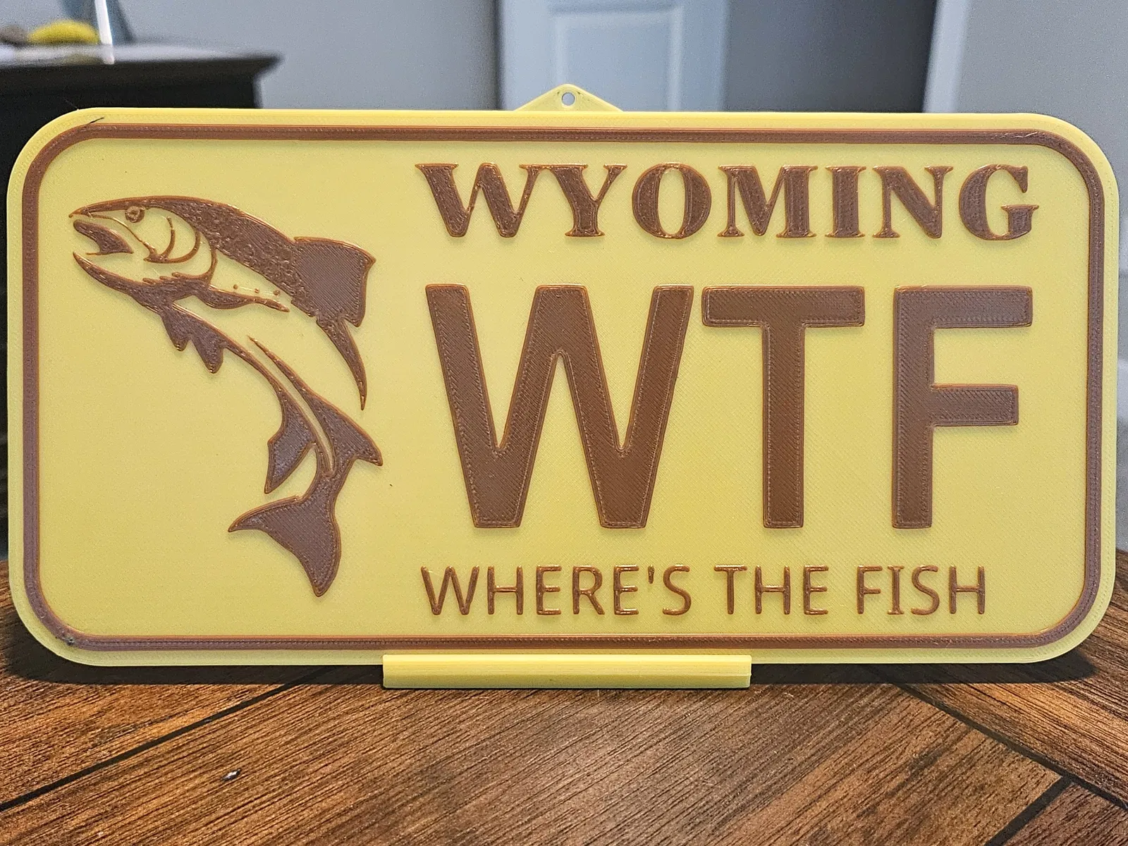 WTF - Where's the Fish! Bố cục theo kiểu biển số Wyoming. Treo tường được hoặc dùng cái chân đế đi kèm để trưng trên mặt bàn. (Nếu bạn để trên mặt bàn thì có thể cắt bỏ cái tab ở phía trên.)