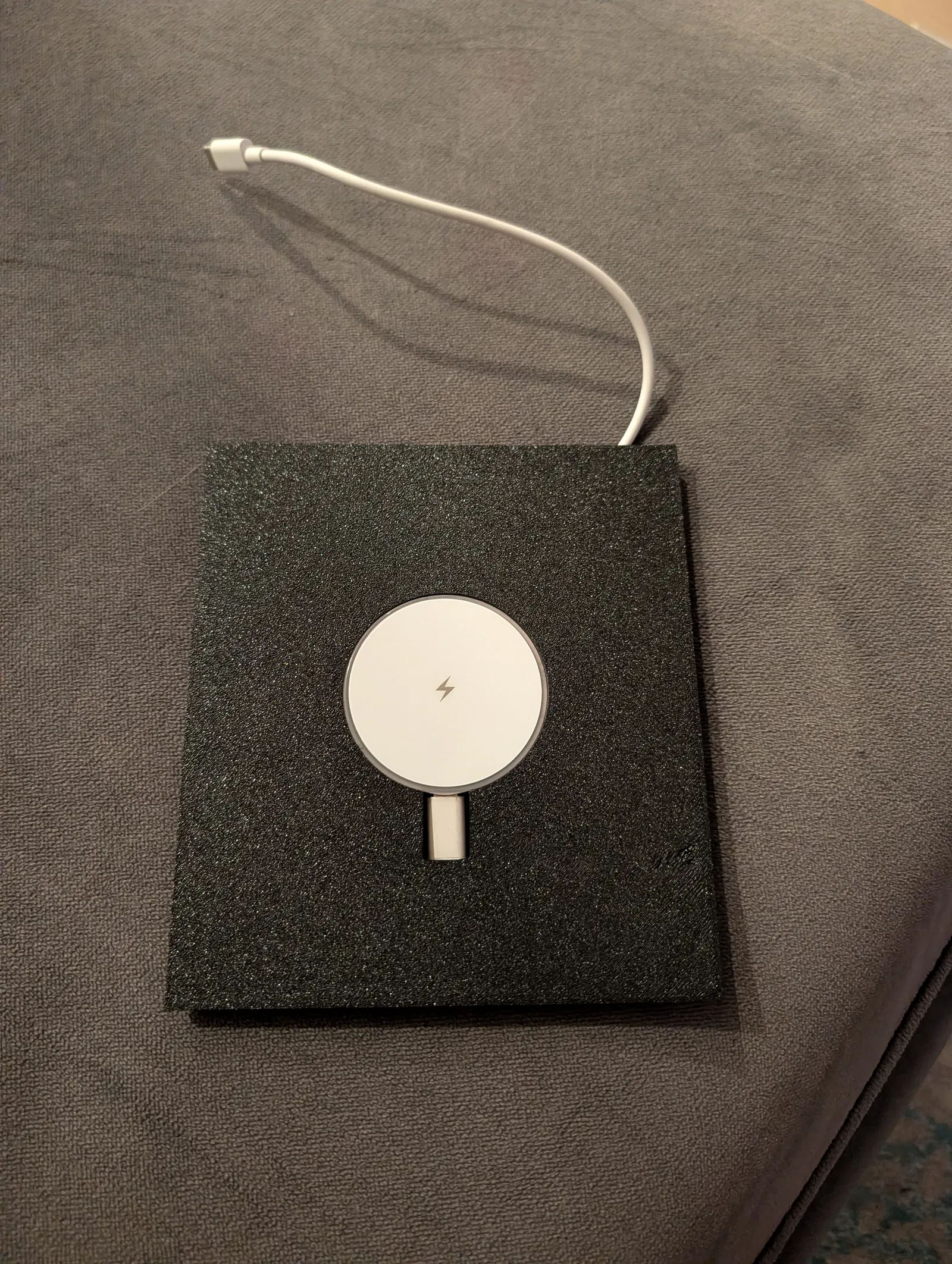 Nhớ tắt bộ sạc wireless zin bằng cách nhấn và giữ nút cho tới khi đèn tắt. Mình dùng MagSafe charger theo link bên dưới. MagSafe charger được lắp kiểu press-fit vào phần giữa. Do mỗi máy in có sai số khác nhau, có thể bạn sẽ cần chà nhám phần giữa một chút để ép vào vừa khít. Mình dán thêm một miếng nỉ dán (sticky felt) phía trên để nhìn giống đồ OEM. Mình test vài ngày rồi, chạy ổn.