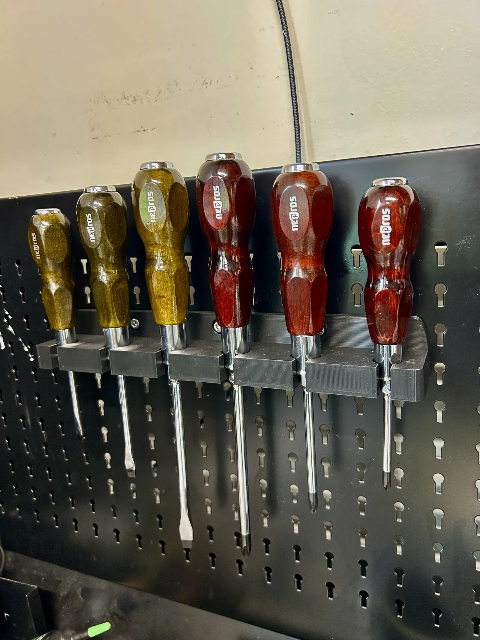 Mẫu giá đỡ tua vít Nepros được mình làm cho đồng nghiệp, thiết kế để bắt ốc gắn vào mặt sau của pegboard. Phù hợp cho việc sắp xếp tua vít gọn gàng trên bảng treo dụng cụ.