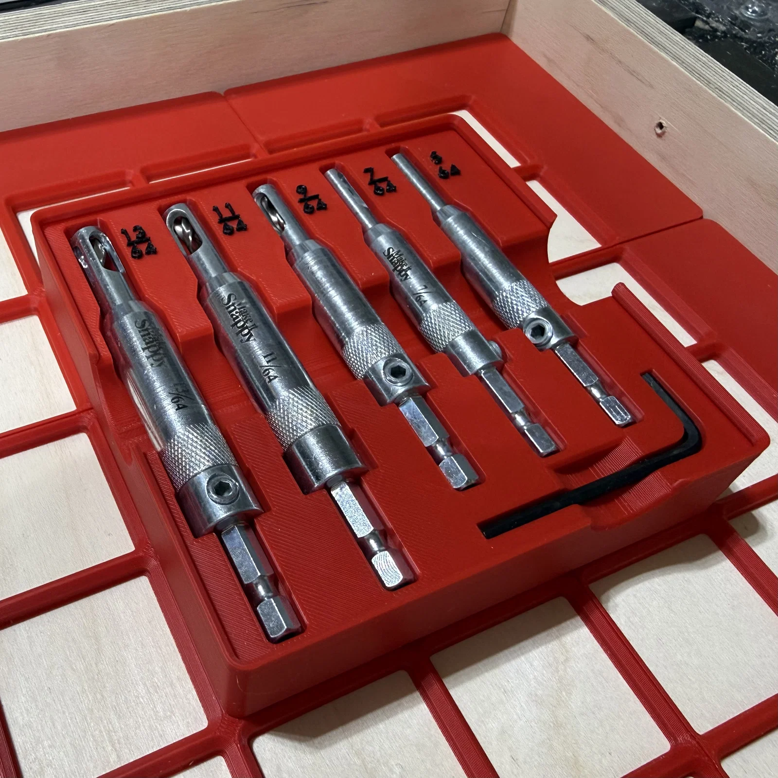 Hộp (bin) Gridfinity 3x3x4 để đựng một bộ 5 mũi khoan tự căn tâm Snappy (5/64", 7/64", 9/64", 11/64" & 13/64").