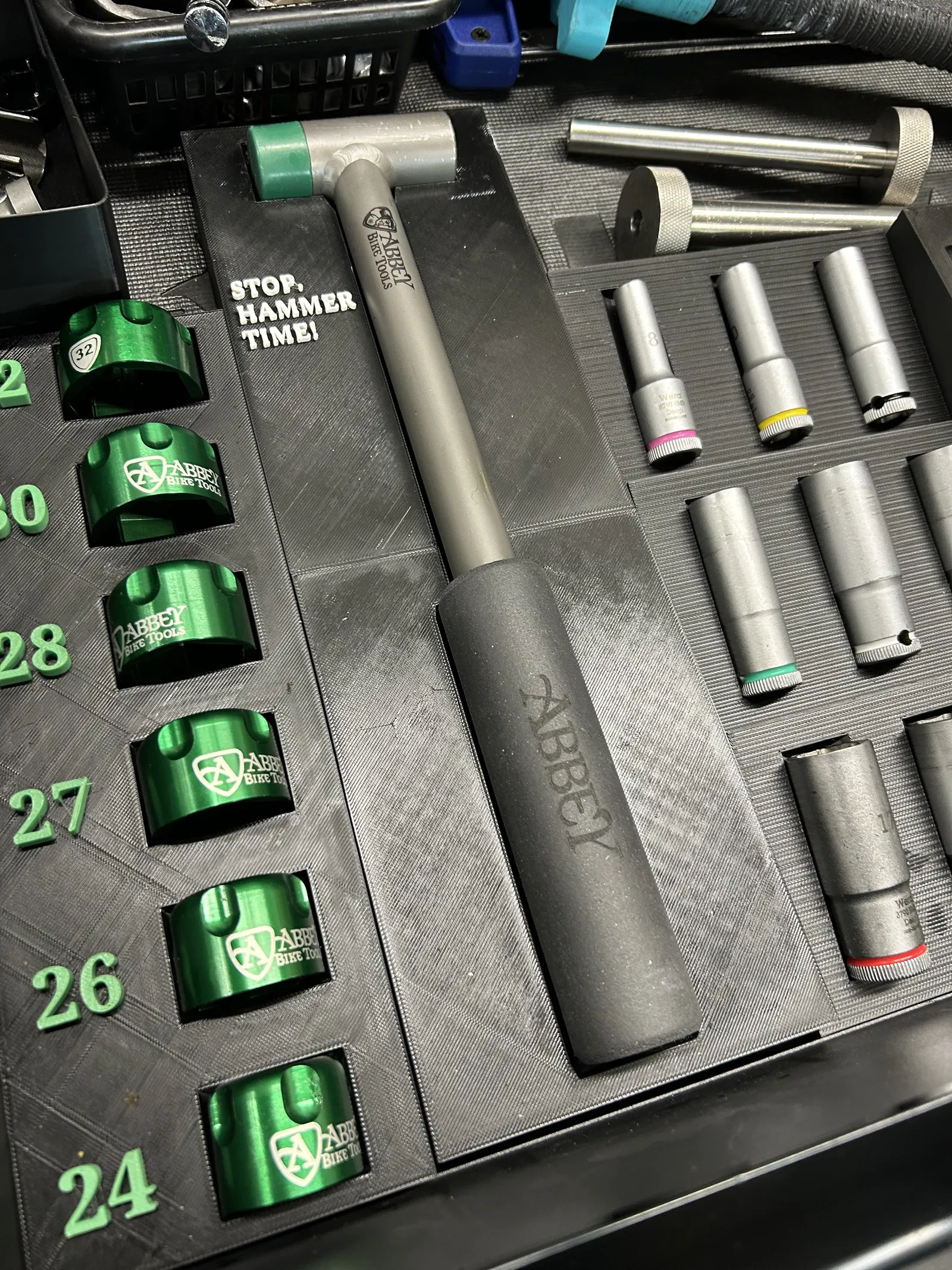 Giá đỡ búa Abbey TI do mình thiết kế. Mẫu được làm dạng phẳng, không có pattern Gridfinity vì mình không cần hệ lưới modular cho dự án này. Phù hợp để sắp xếp búa gọn gàng trong khu vực làm việc.