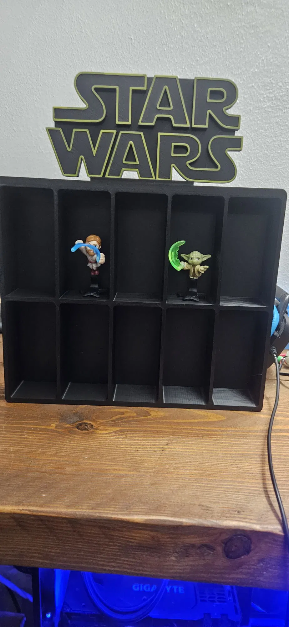 Thiết kế dạng lưới gọn gàng với nhiều ngăn riêng biệt, rất hợp để cất đồ chơi Kinder Egg, mini figures hoặc các món sưu tầm nhỏ khác. Phần panel trang trí phía trên lấy cảm hứng từ thẩm mỹ vũ trụ sci-fi biểu tượng, nên đặt trong phòng gaming, trên bàn làm việc hay kệ trưng bày đều hợp.