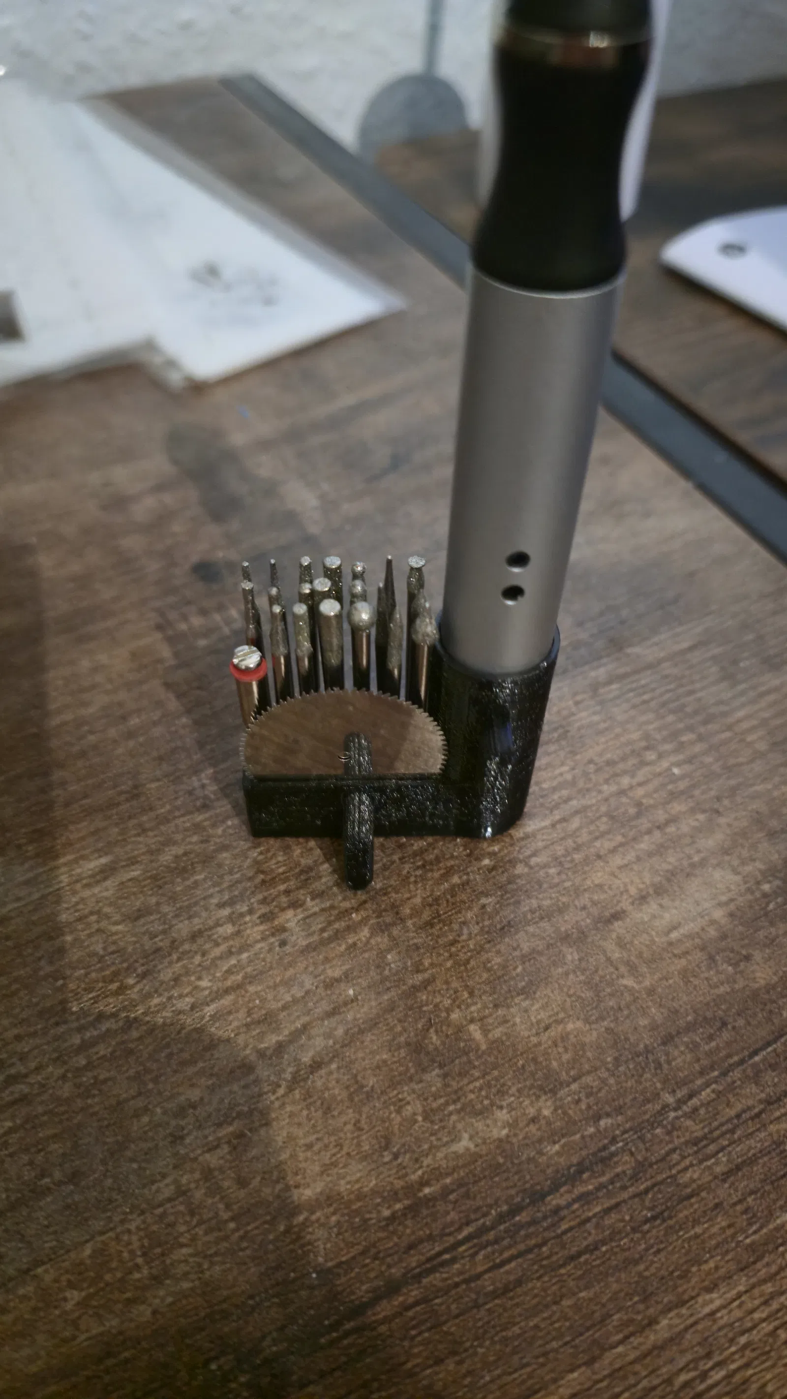 Ngàm gắn Skadis cho bút khắc (engraving tool) kèm giá giữ dụng cụ, thiết kế ban đầu cho Stahlwerk UG-300 ST 8W nhưng nhiều mẫu aftermarket cùng kích thước cũng dùng được. Đường kính bút 16mm, nên in kèm support.