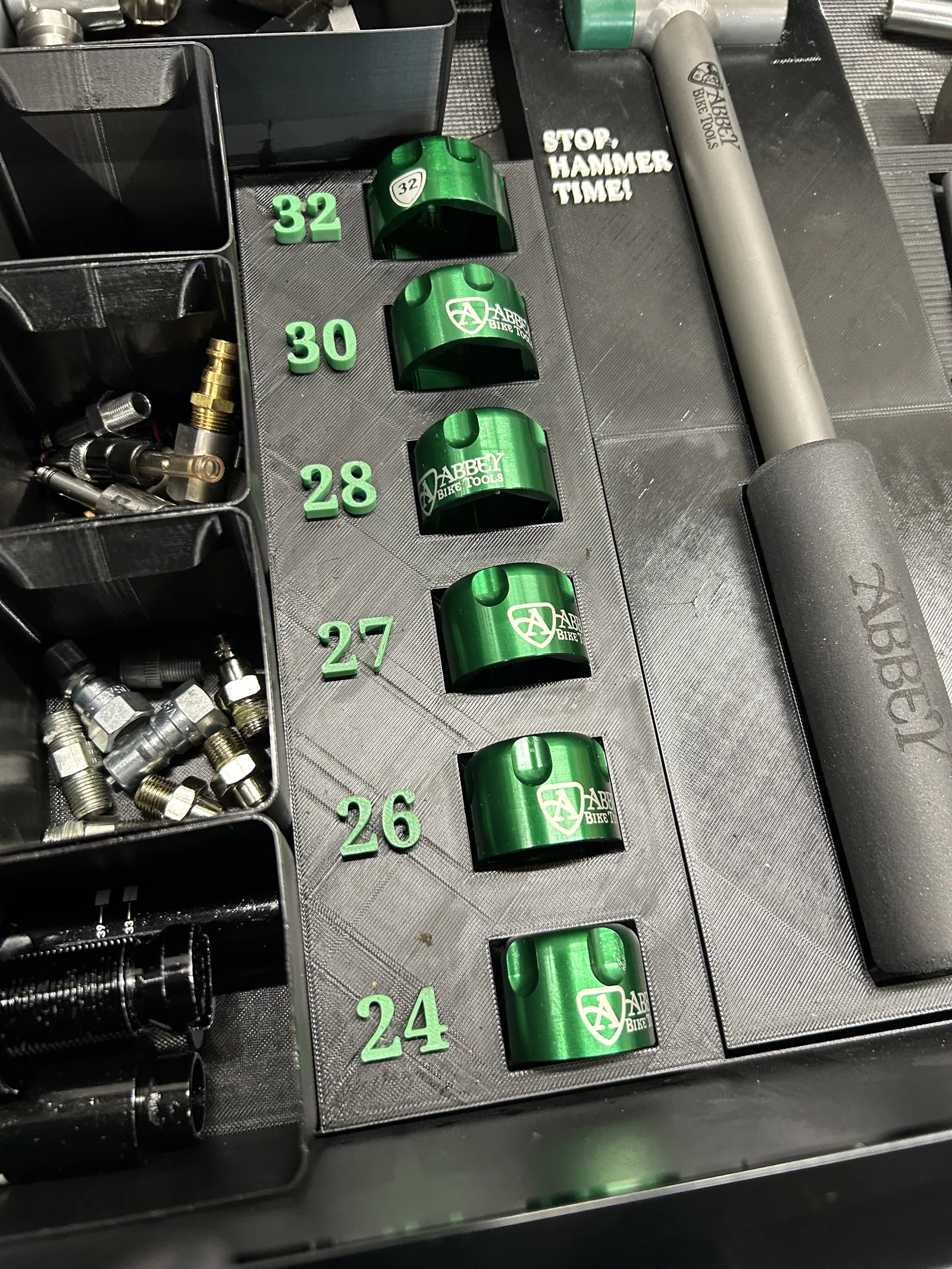 Khay/đế giữ cho Abbey suspension top cap sockets, thiết kế dạng phẳng để đặt gọn gàng. Không dùng pattern Gridfinity vì không có nhu cầu gắn theo lưới, phù hợp để sắp xếp dụng cụ đơn giản.