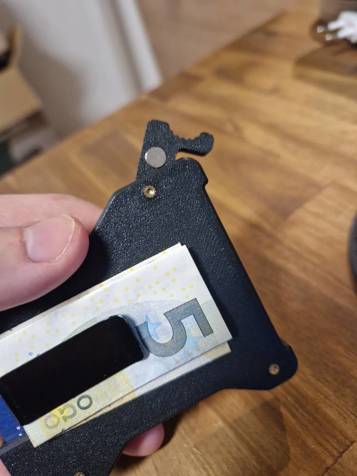 Cánh tay nam châm giúp đảm bảo thẻ không bị lỏng hay rơi ra. Phần rãnh ở “đáy” ví cho phép bạn đẩy thẻ lên để lấy ra dễ dàng.