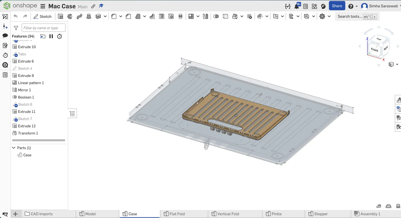 Mẫu ốp Mac Air M4 phiên bản SCALED DOWN, có lỗ thoáng và chân đỡ tích hợp để nâng máy khỏi mặt bàn giúp tản nhiệt. In các chi tiết, riêng pintle và stopper cần in 2 cái để lắp khớp các vòng.
