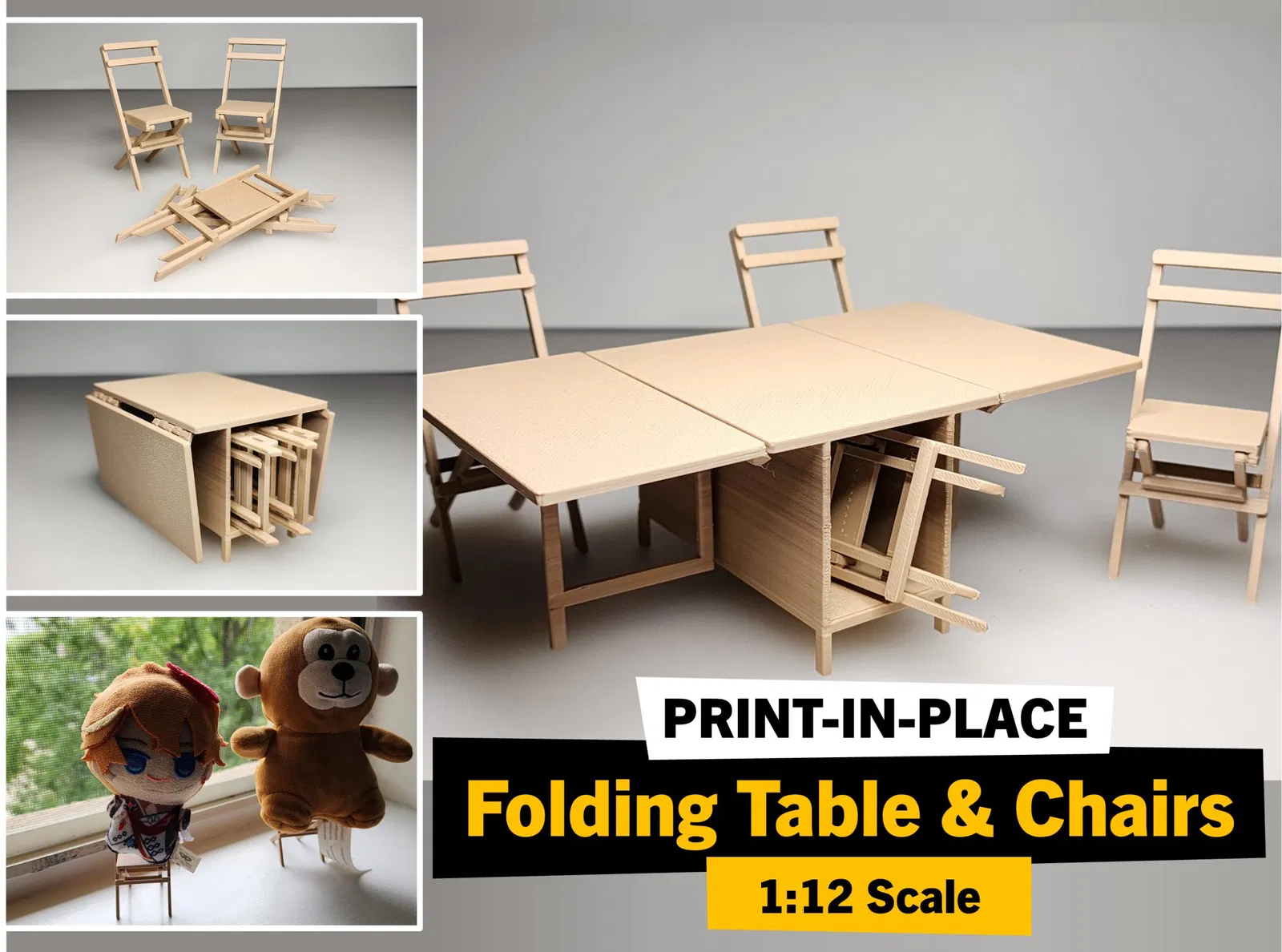Đây là một bàn ăn có kích thước tỷ lệ 1:12, in sẵn, có thể gấp lại với chỗ để ghế gấp và bản lề hoạt động! Dành cho những con búp bê sống trong những ngôi nhà búp bê kích thước căn hộ, nơi không gian là rất quý giá!
