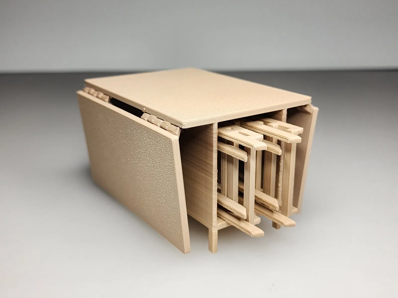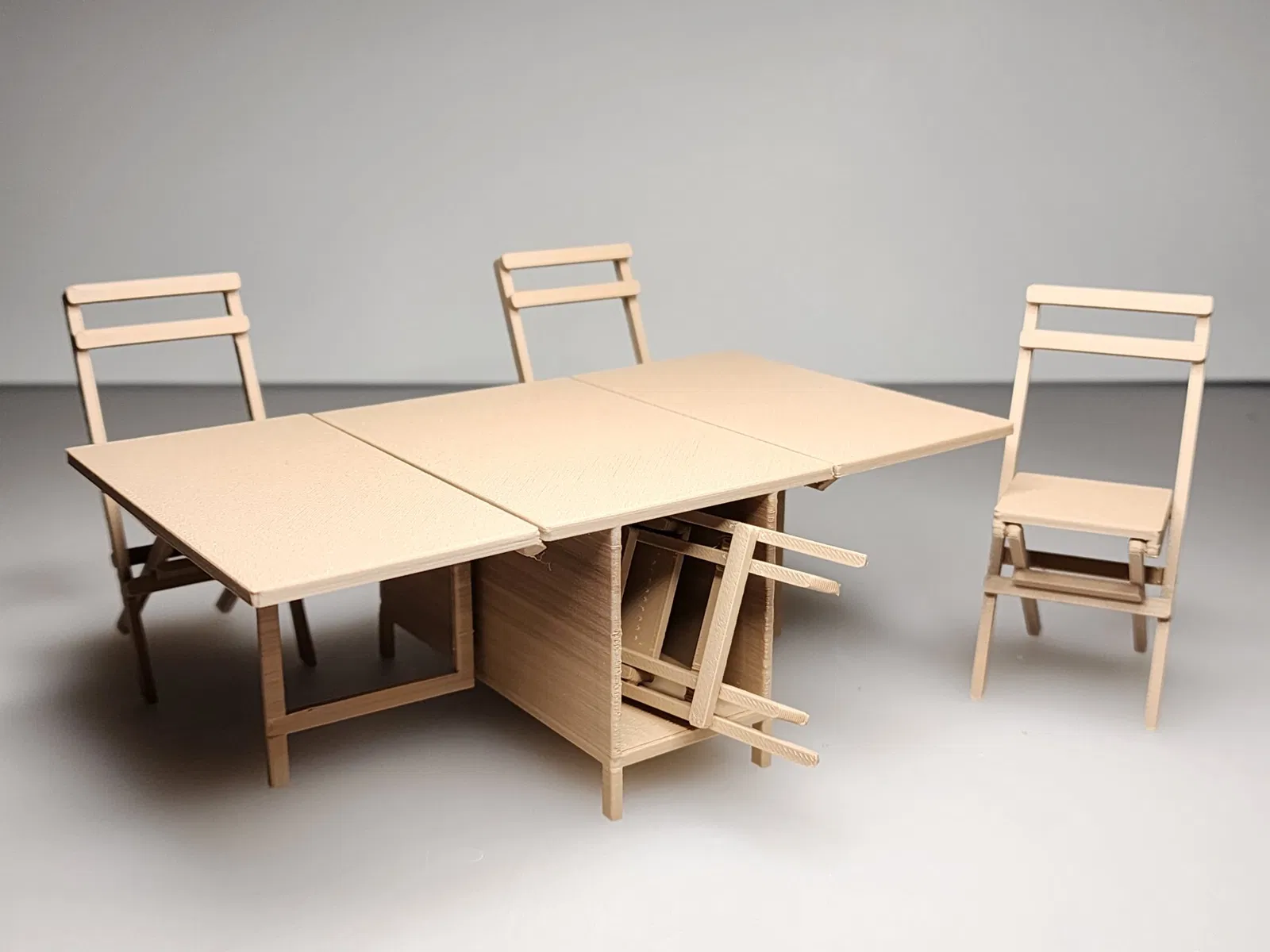 Đây là một bàn ăn lá in tại chỗ 1:12 với lưu trữ cho ghế gấp.