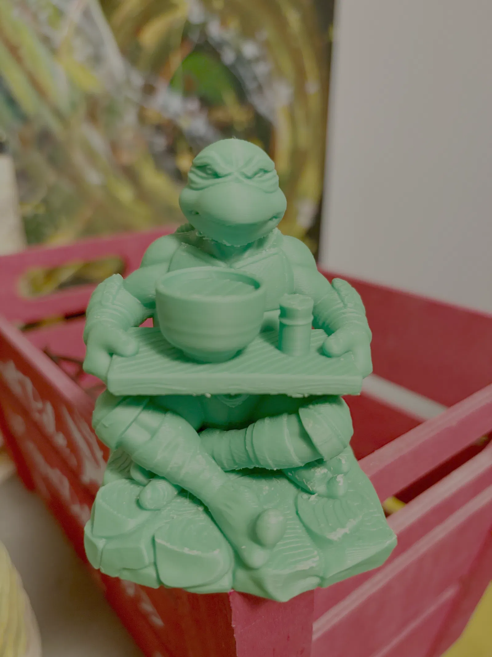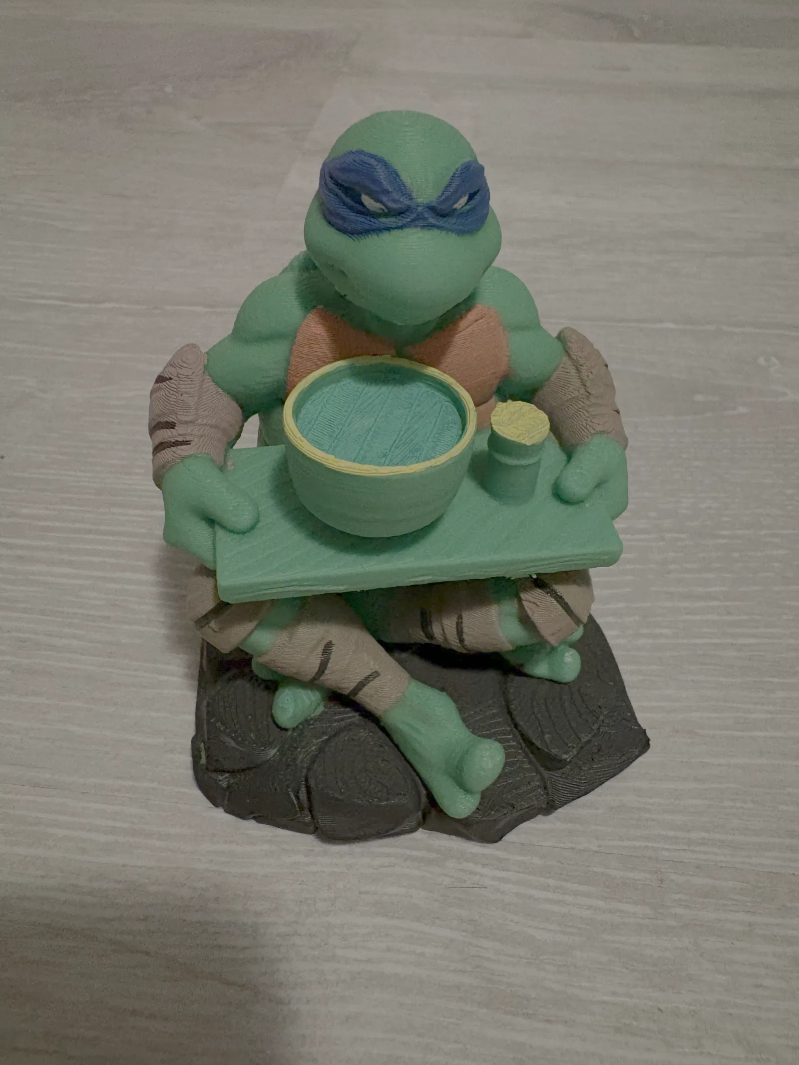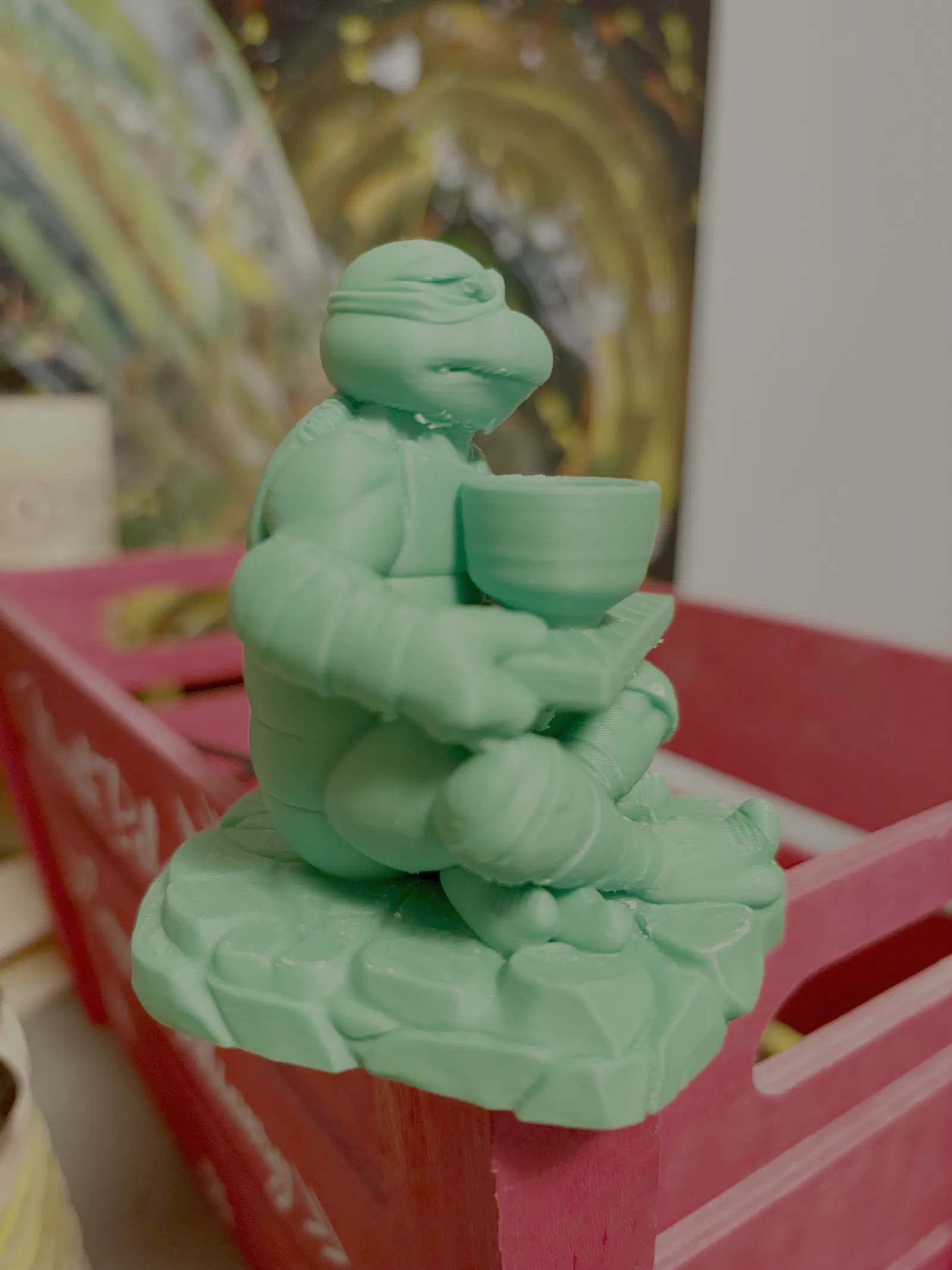 Mẫu 3D đầu tay của mình: kết hợp rùa ninja TMNT với một ly trà matcha. Cảm giác thấy nhân vật thành hình 3D thật khó tin, và mình cực kỳ tự hào về kết quả. Đây chỉ là khởi đầu, sẽ còn nhiều mẫu nữa!