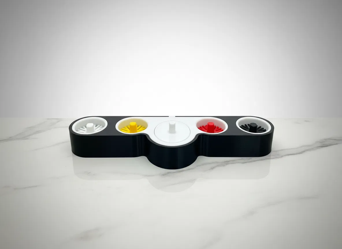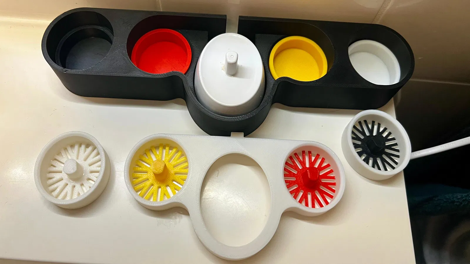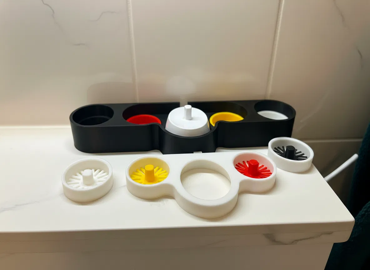 Đây là một bộ organizer đặt trên bồn rửa (vanity organizer) được thiết kế riêng cho bàn chải điện Oral-B. Sau một thời gian bực vì mặt bàn lộn xộn và bàn chải hay bị ngã, mình làm ra cái station này để giữ 4 cây bàn chải cùng với đế sạc cảm ứng tiêu chuẩn trong một khối gọn gàng.