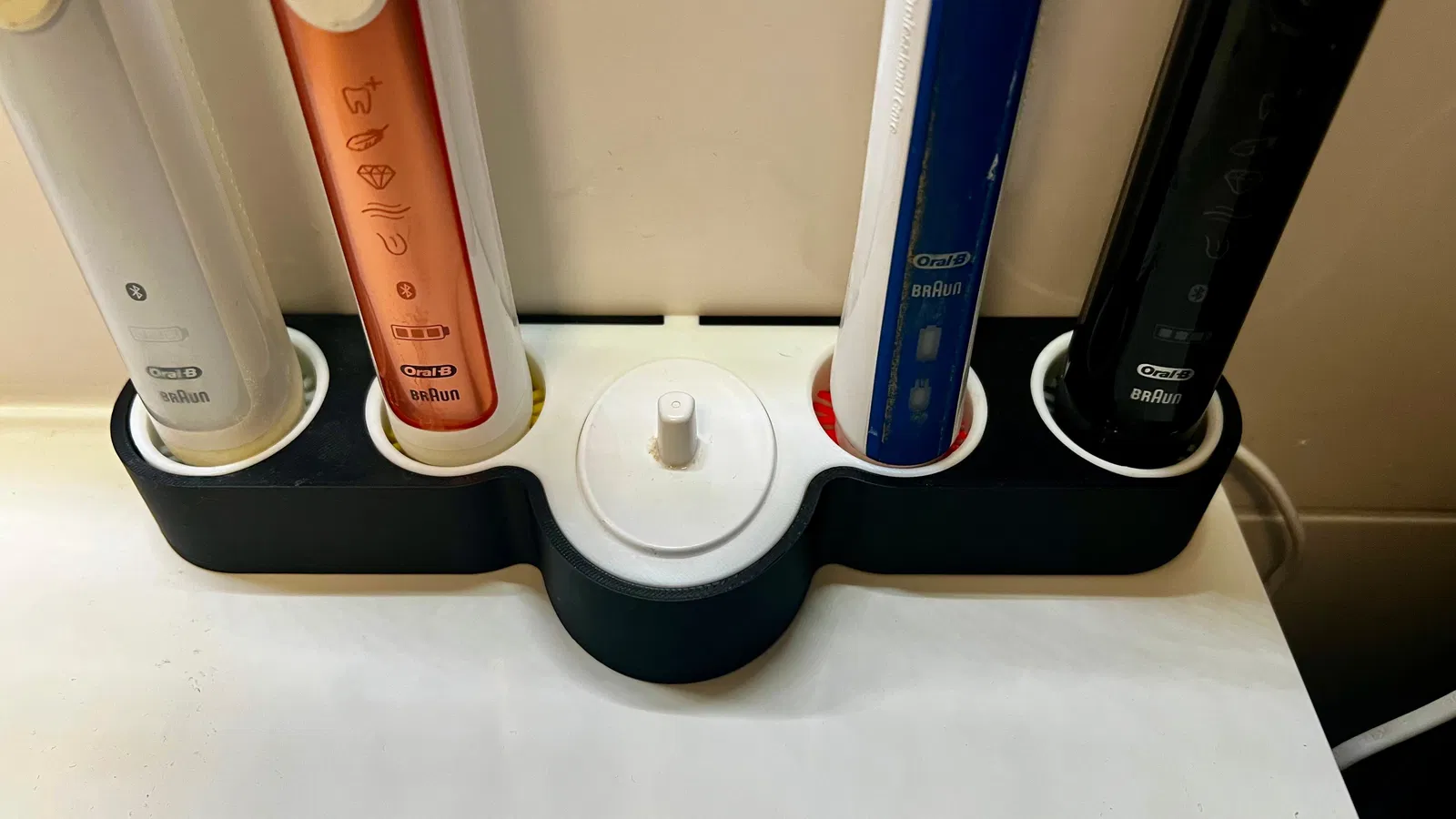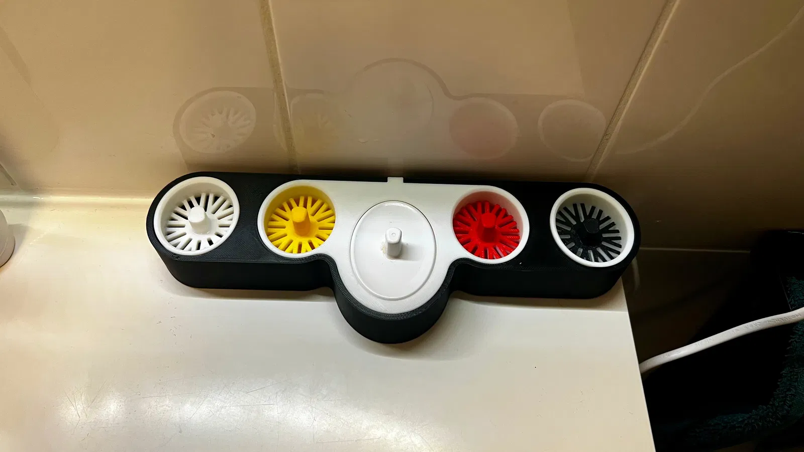 Organizer gọn đẹp cho gia đình dùng bàn chải điện Oral-B: giữ 4 tay cầm và đế sạc cảm ứng tiêu chuẩn trong một khối. Có khay hứng nước chống cặn vòng trên mặt lavabo, thiết kế vững, in không cần support.
