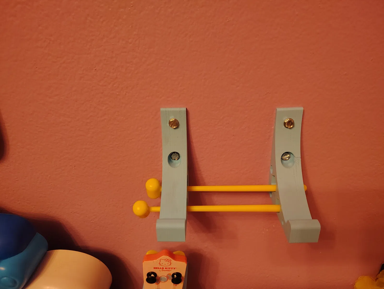 Bracket dùng để cố định đàn xylophone cho trẻ em, thiết kế mặt nghiêng, lỗ vít inset và ngàm giữ dùi gõ (mallet) dạng hình học. Phù hợp làm góc âm nhạc riêng trong phòng ngủ của bé.