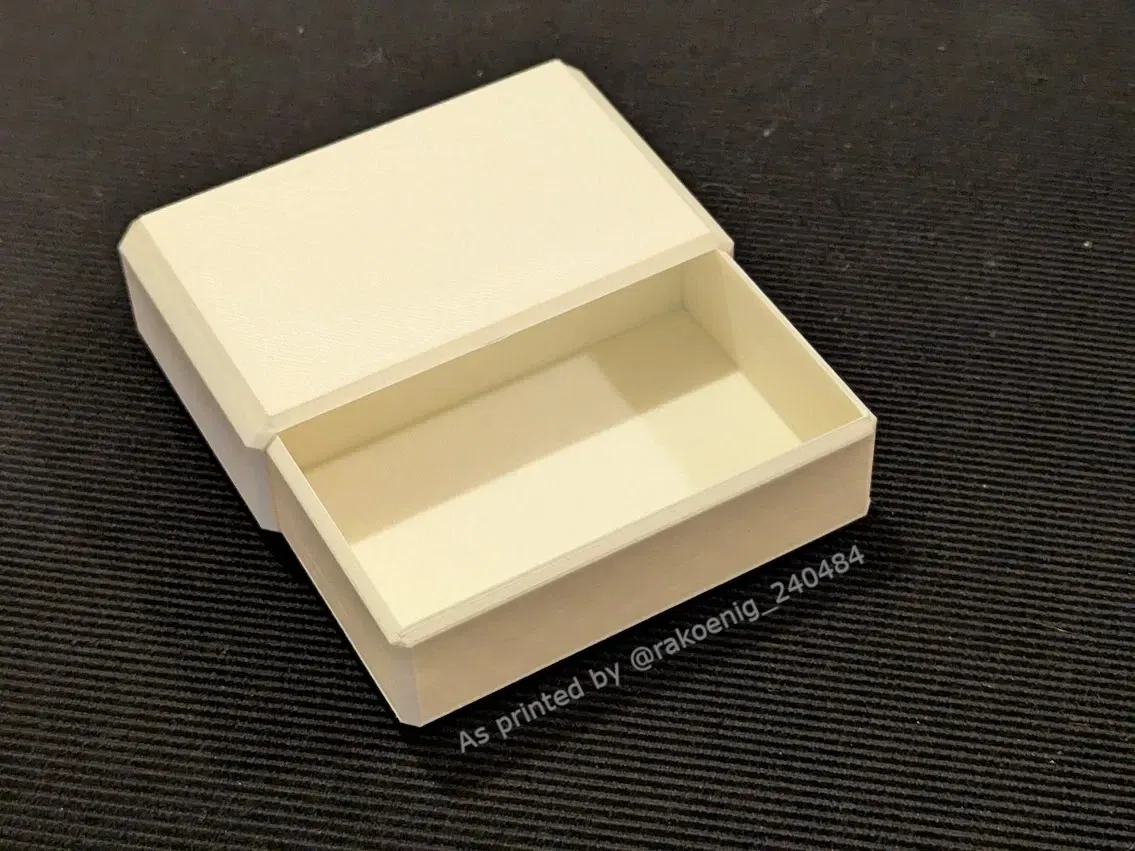Hộp lưu trữ tùy chỉnh với nắp trượt tiện dụng, thiết kế tối ưu để in 3D không cần support. Bạn có thể chỉnh kích thước trong OpenSCAD hoặc nhờ tạo phiên bản theo số đo lòng trong và độ dày mong muốn.