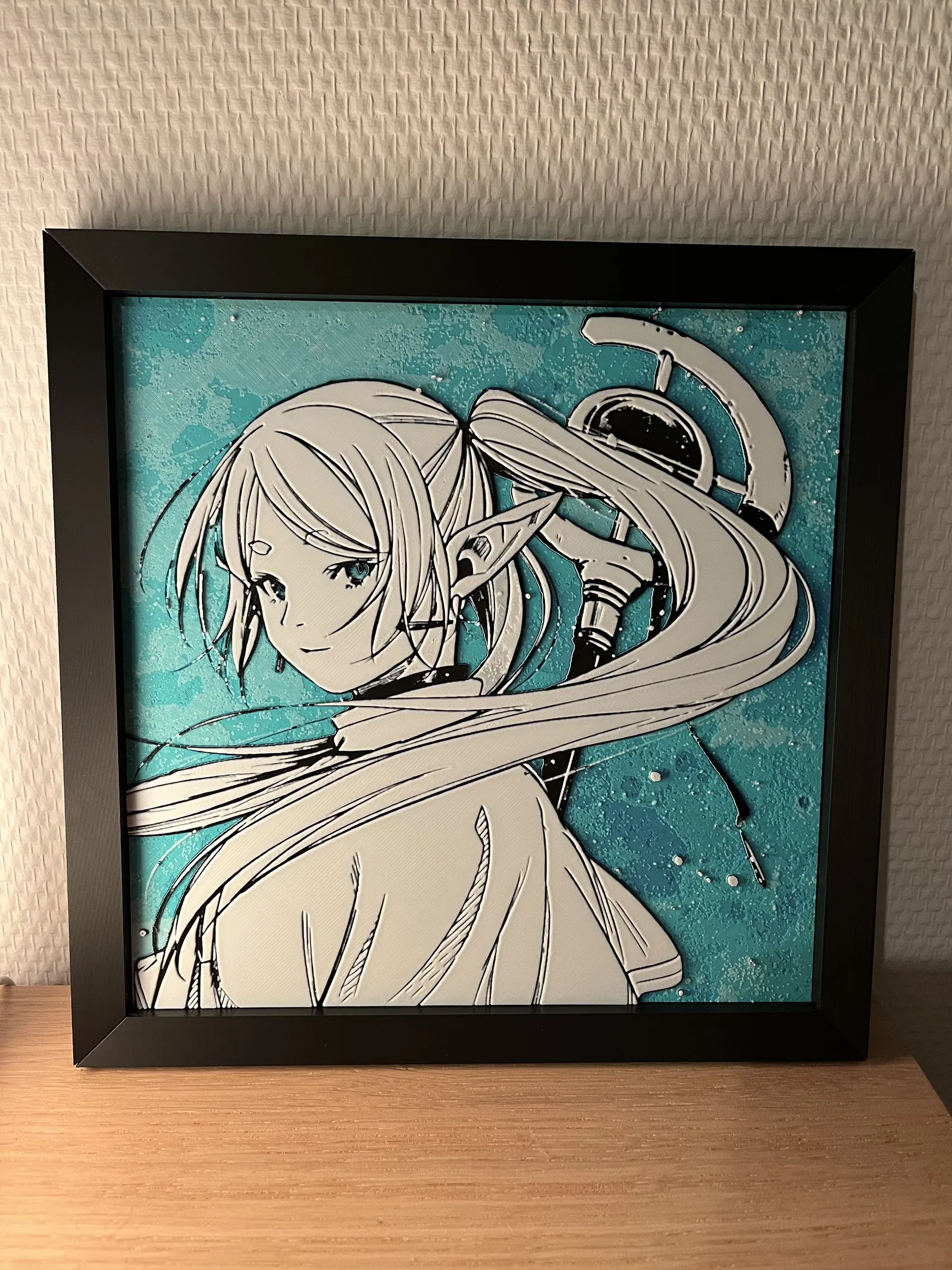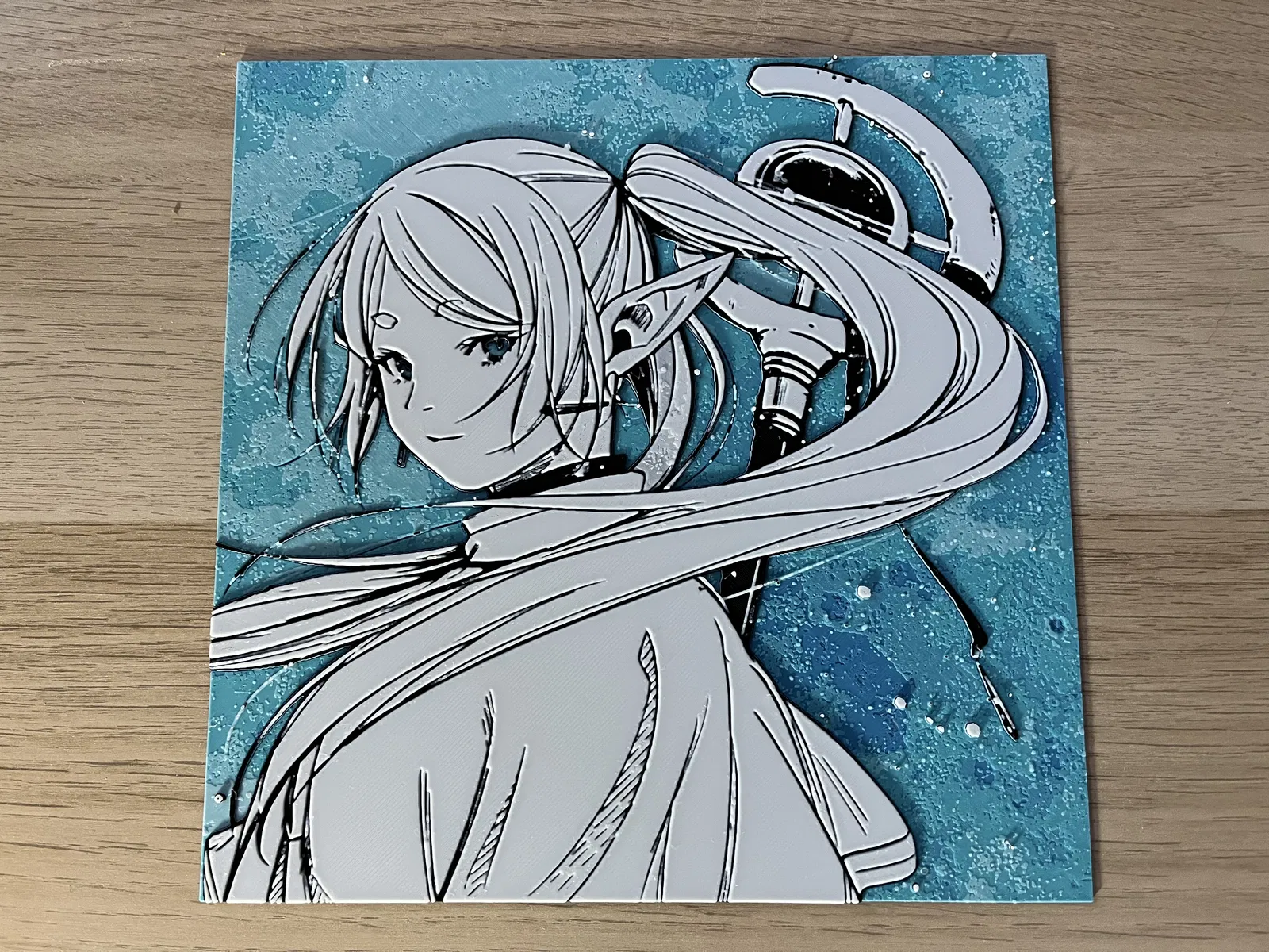 Minh hoạ Frieren này là bản remix từ artwork cực đẹp của frieren_pr, đã được chuyển đổi và tối ưu để in bằng HueForge.