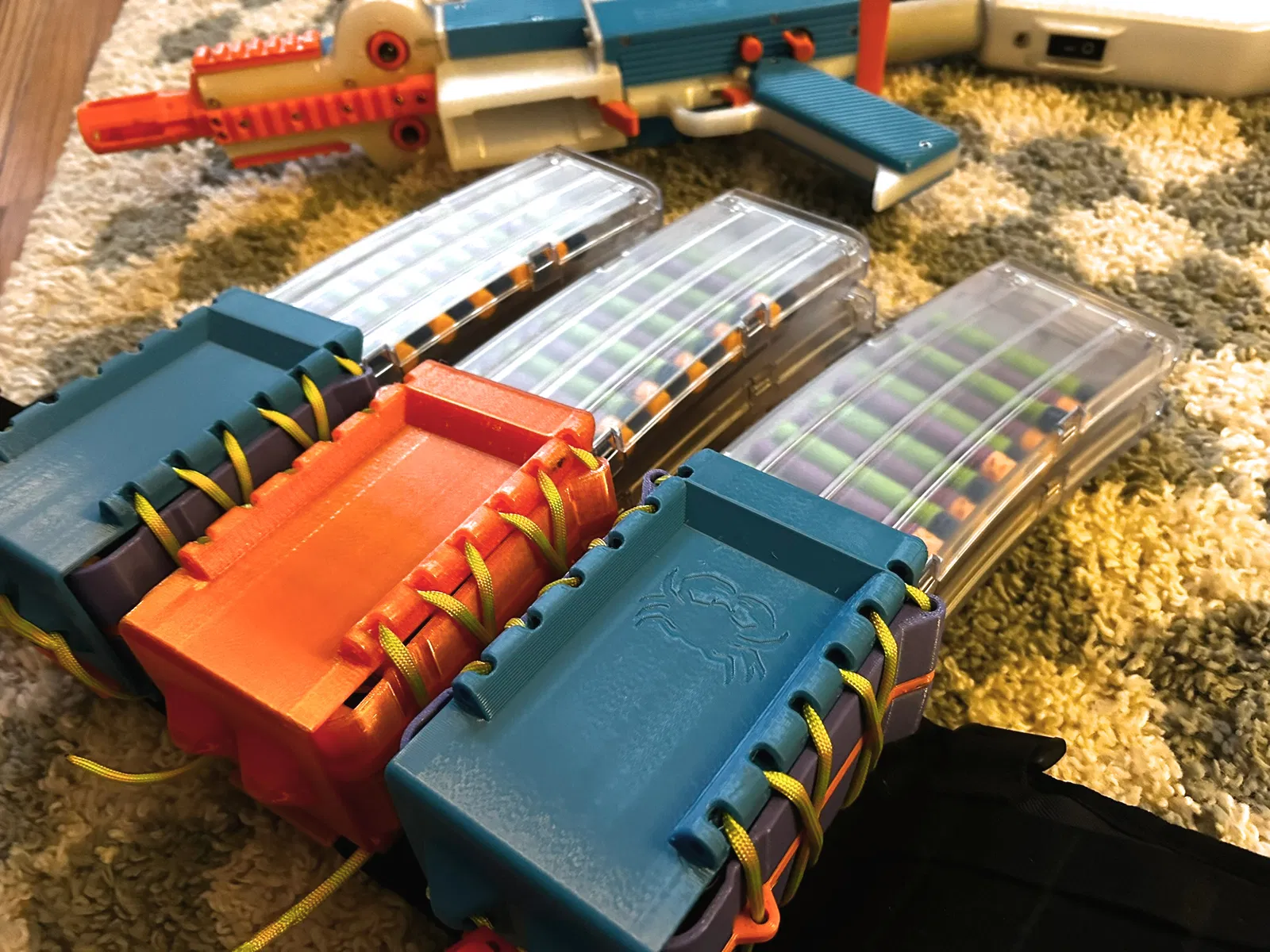 MagCrab là mẫu in 3D để cất/gắn các full-length Nerf Mag lên hệ MOLLE. Khuyến nghị in PETG với infill cao (tốt nhất 100%), nhiều perimeters, dùng paracord 3–4mm (khoảng 142cm/cái) và cord lock nếu có.