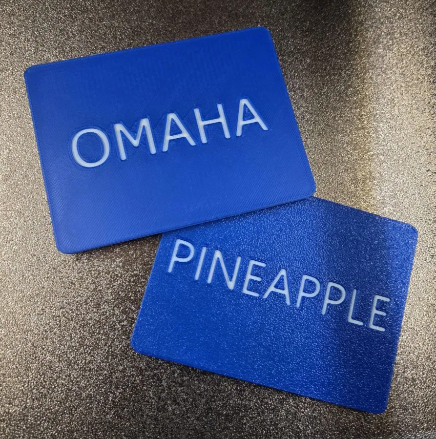 Bộ plaque poker mixed game in 2 mặt, giúp theo dõi nhanh các biến thể khi chơi (holdem, omaha, stud, pineapple, 7card…). Kích thước 3"x4"; gợi ý thông số in: 0.2 layer height, 10% infill, pause đổi màu.