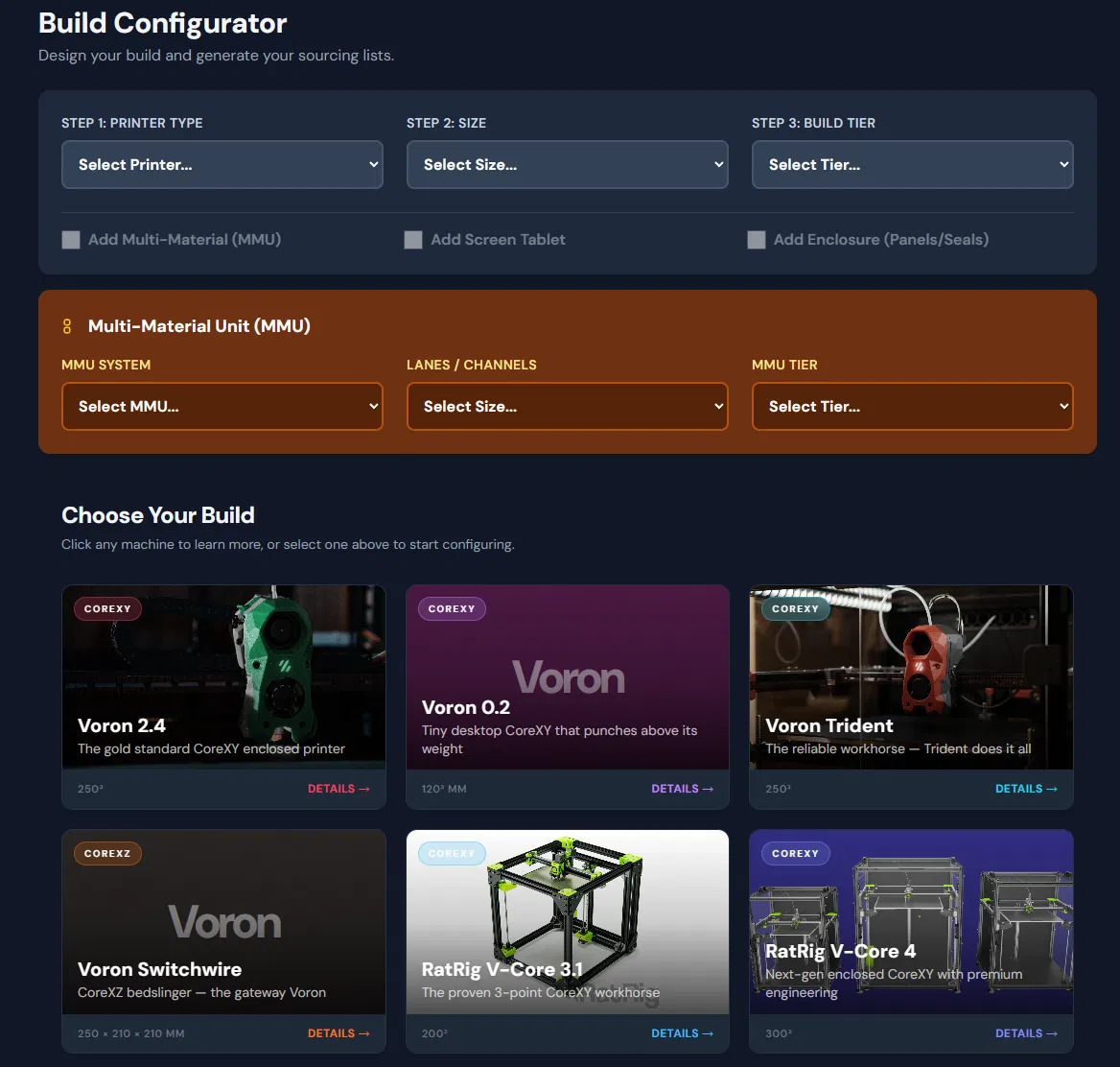 Build Configurator — Chọn máy in (Voron 2.4, Trident, RatRig V-Core, và nhiều mẫu khác), chọn build volume và tier, rồi nhận về Bill of Materials đầy đủ gồm số lượng, tên linh kiện, và link mua trực tiếp. Các add-on như MMU, enclosure, và màn hình có thể thêm vào chỉ bằng một checkbox. Có tab riêng cho người mua kit và người tự đi sourcing.