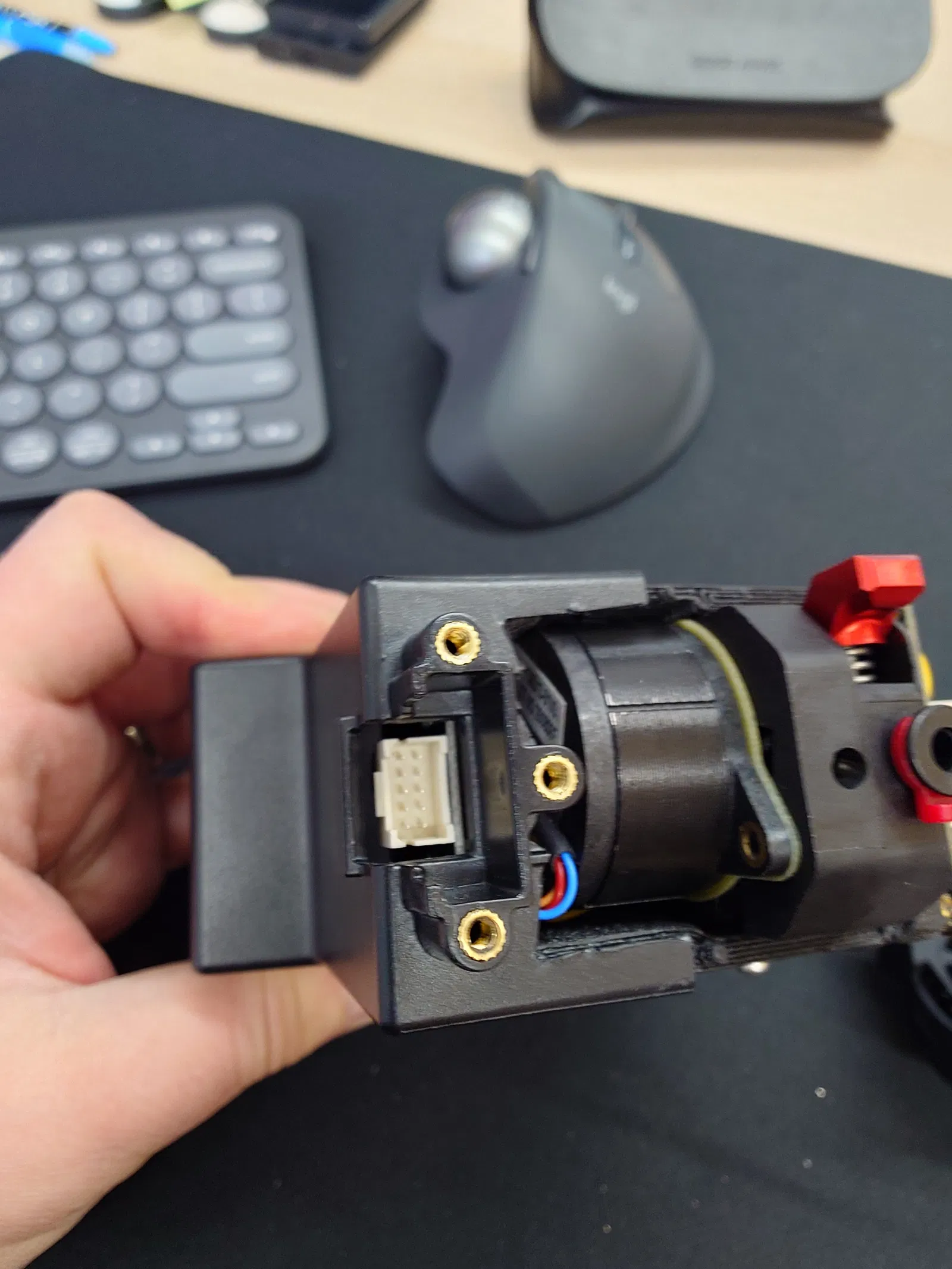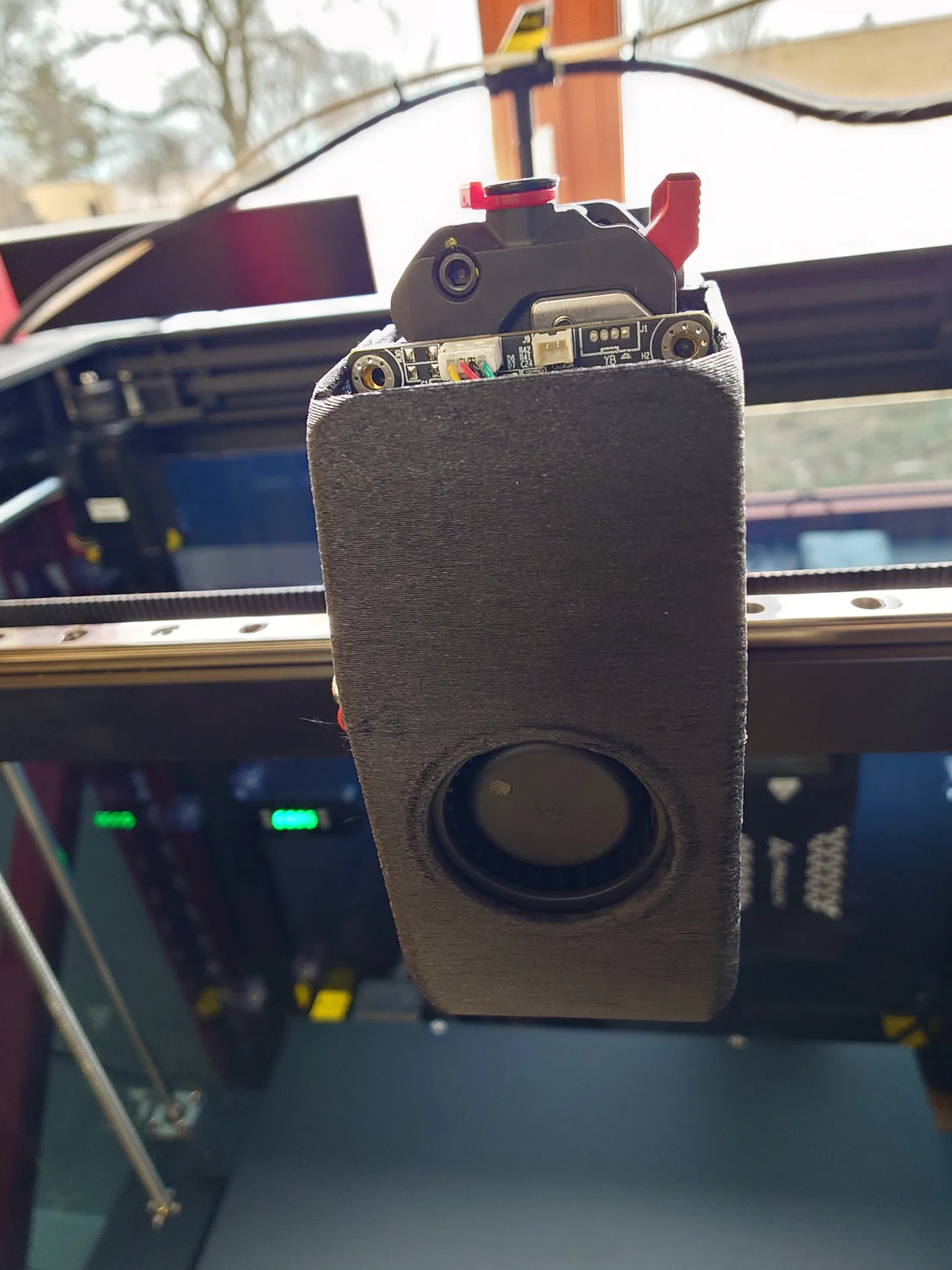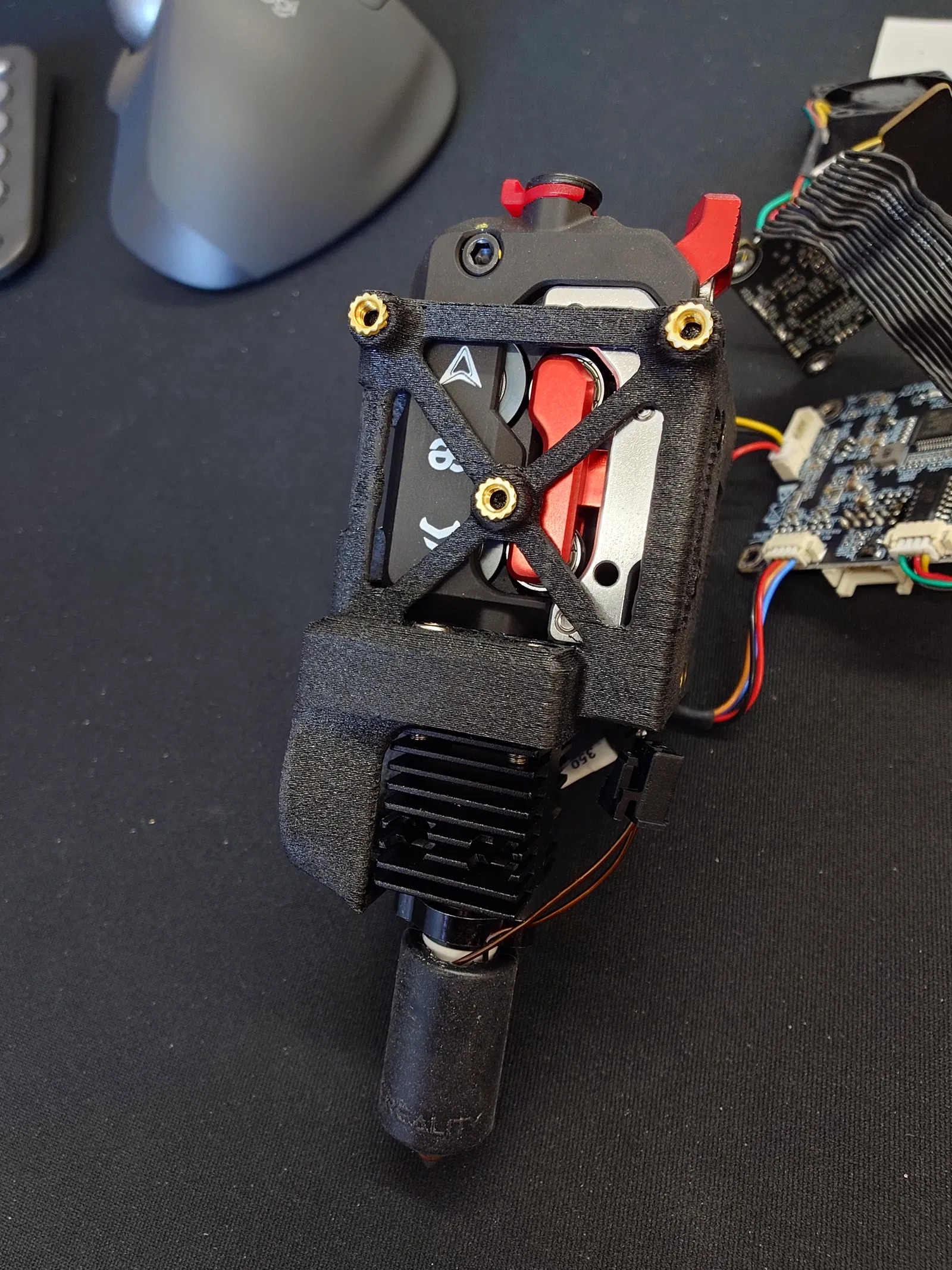 Hãy in ngược (upside down) để bề mặt quan trọng nhất của phần tiếp xúc hot end—mặt trên phẳng nằm ngang—được đẹp và chuẩn. Mình chọn vật liệu PPA-CF để đạt độ cứng và khả năng chịu nhiệt tốt nhất.