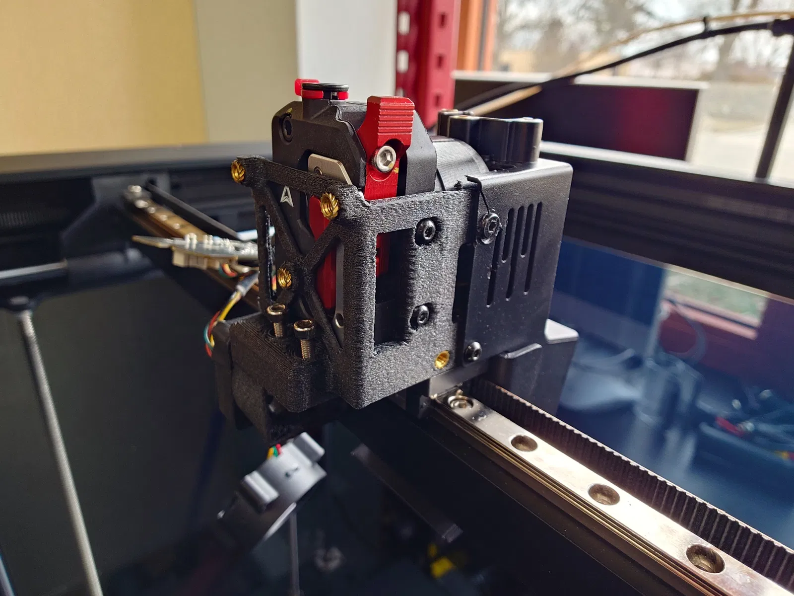 Khung (cage) nâng cấp cho Ender 5 Max giúp dùng được extruder DXC và hot end K2 plus, hỗ trợ in các filament mài mòn như CF/GF tới 350°C. Khuyến nghị in upside down; PPA-CF cho độ cứng và chịu nhiệt cao.
