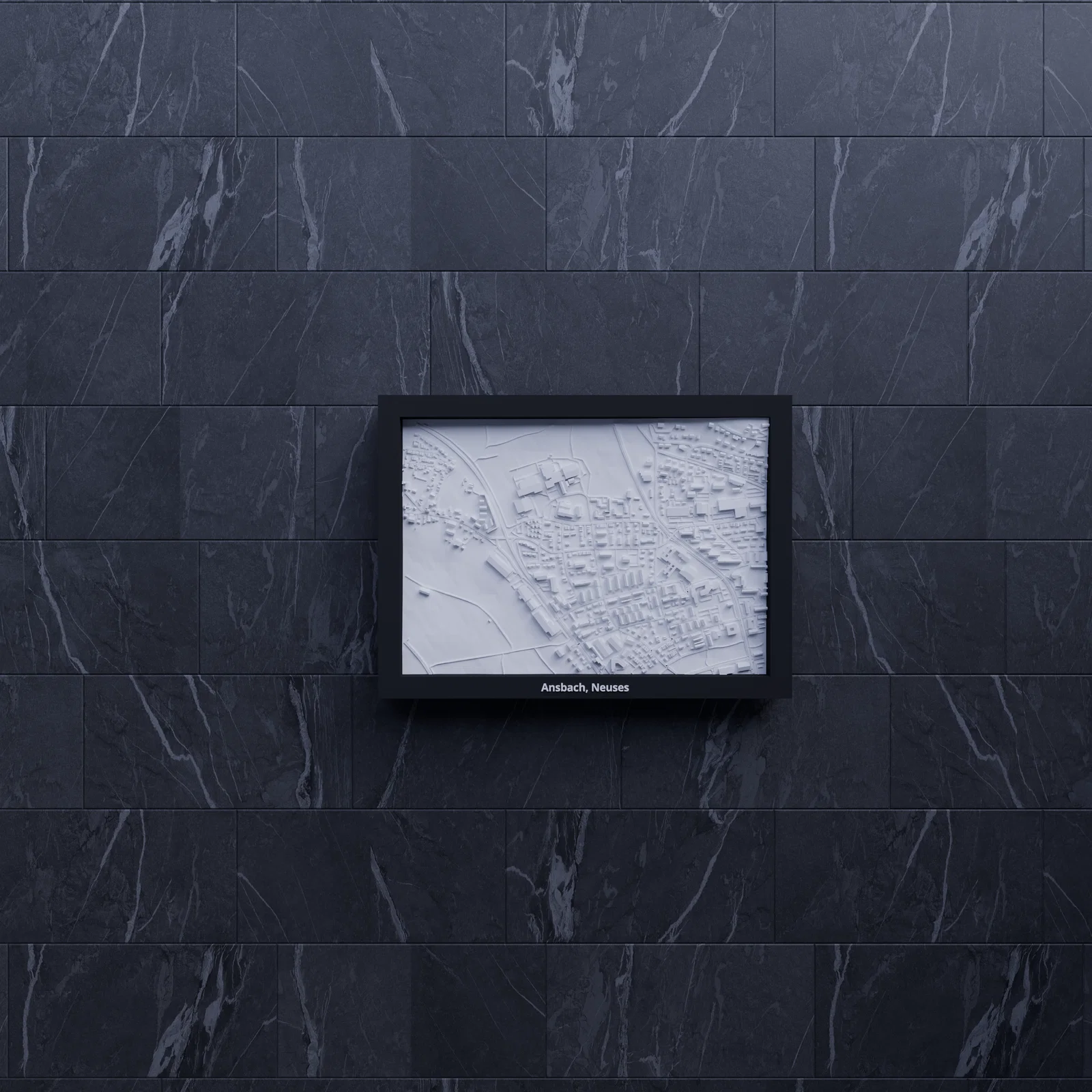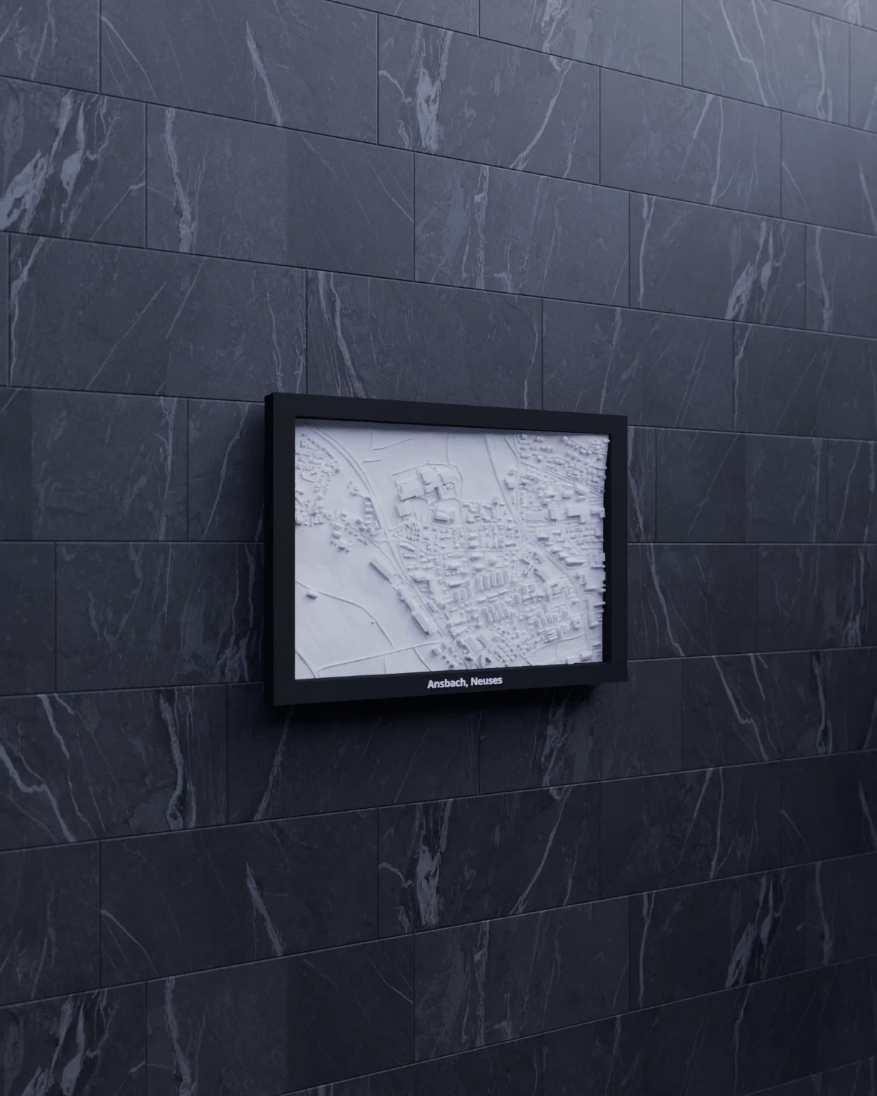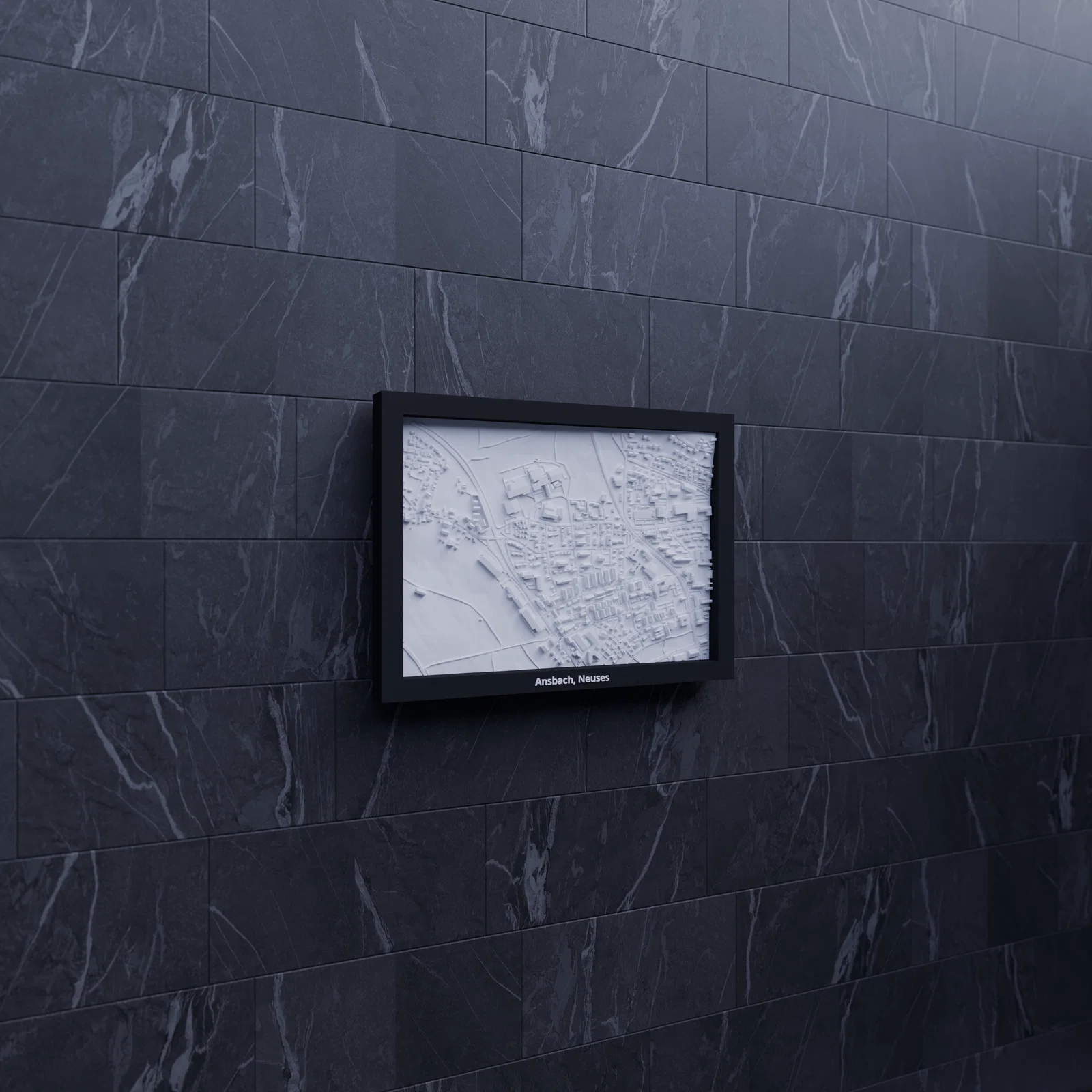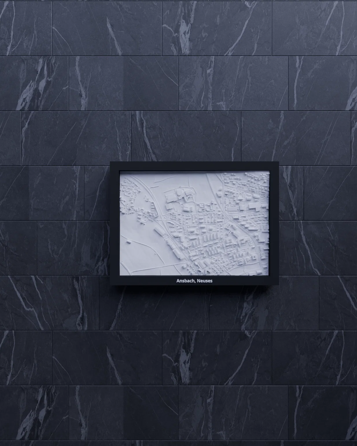 Mô hình địa hình (topographic) 3D của Ansbach, Neuses (Đức), dựng từ dữ liệu địa lý và thu nhỏ còn 170.5 x 119.5 mm (tỉ lệ ~8015:1). Có STL/3MF, nhiều frame, kèm profile in tối ưu.