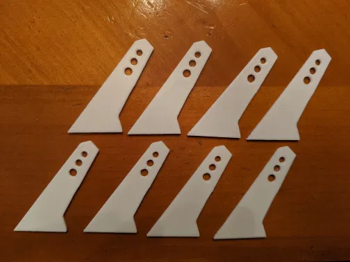 Thanh chống bên (side strut) cho chân đáp của tên lửa mô hình Outlander. Tỉ lệ gần 1:1 so với Estes Outlander – mình giảm 10% (trong Cura) trước khi in để khớp tốt hơn với bộ chân đáp tỉ lệ 1:1. Mình in đủ 8 thanh chống trên mặt kính, trong đó lật ngược 4/8 cái sang phía đối diện. Cách này giúp bề mặt ngoài của cả 8 thanh chống đều mịn.