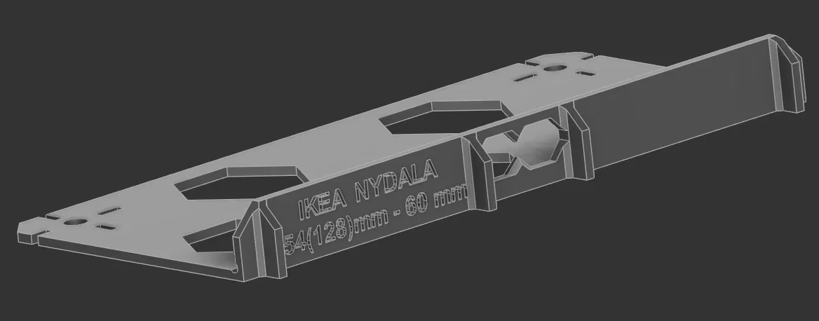 Jig/guide khoan để khoan lỗ gắn tay nắm IKEA NYDALA 154 mm lên đồ nội thất. Hai lỗ cách nhau 128 mm và cách mép 60 mm. Có kèm vạch canh dấu tâm và các cửa sổ canh giữa cho vị trí lỗ khoan.