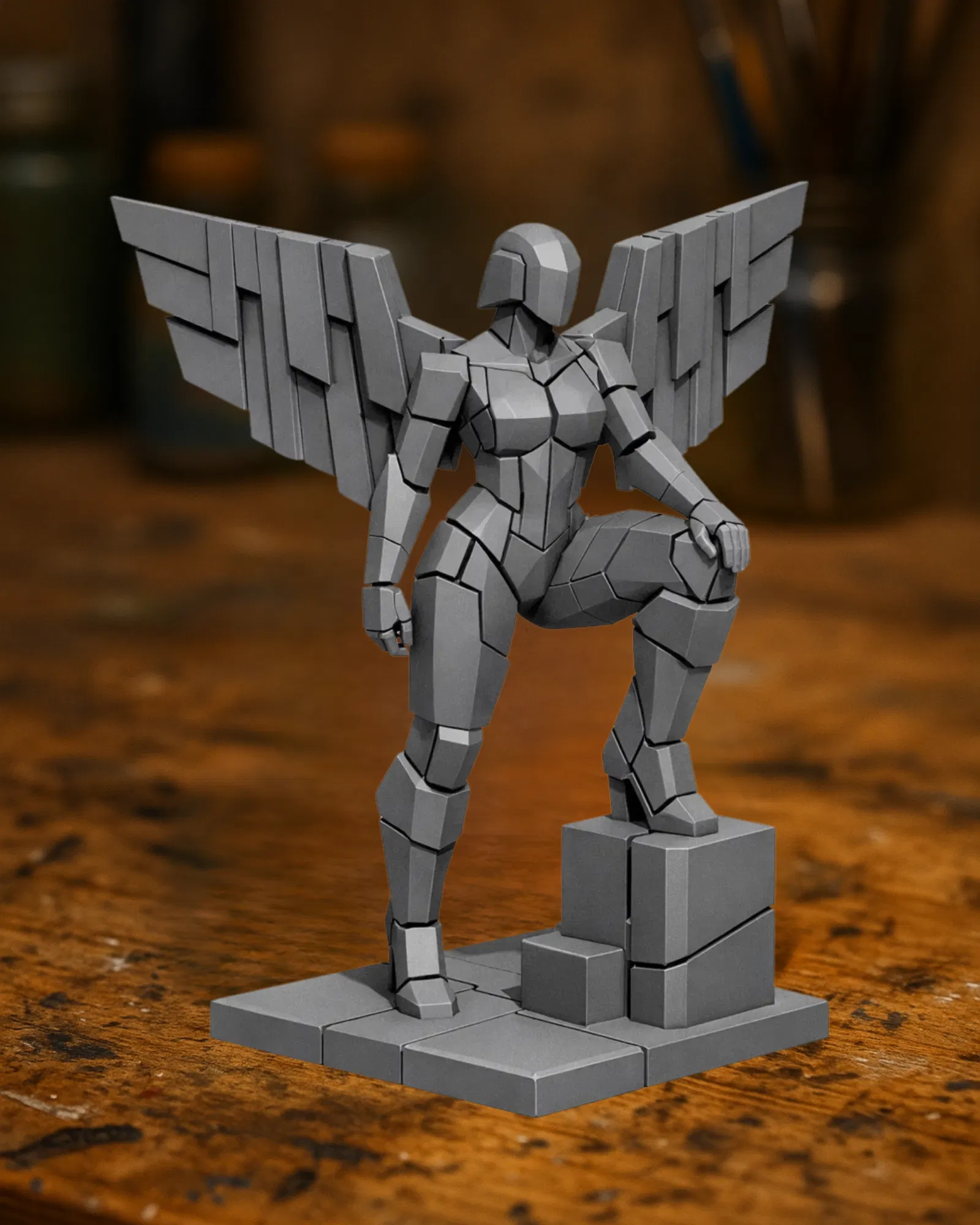 Mẫu tượng Valkyrie phong cách tương lai với nữ hộ vệ giáp hình khối sắc nét, đôi cánh cơ khí nổi bật và dáng đứng uy nghi, mạnh mẽ như đang trấn giữ từ vị trí cao.