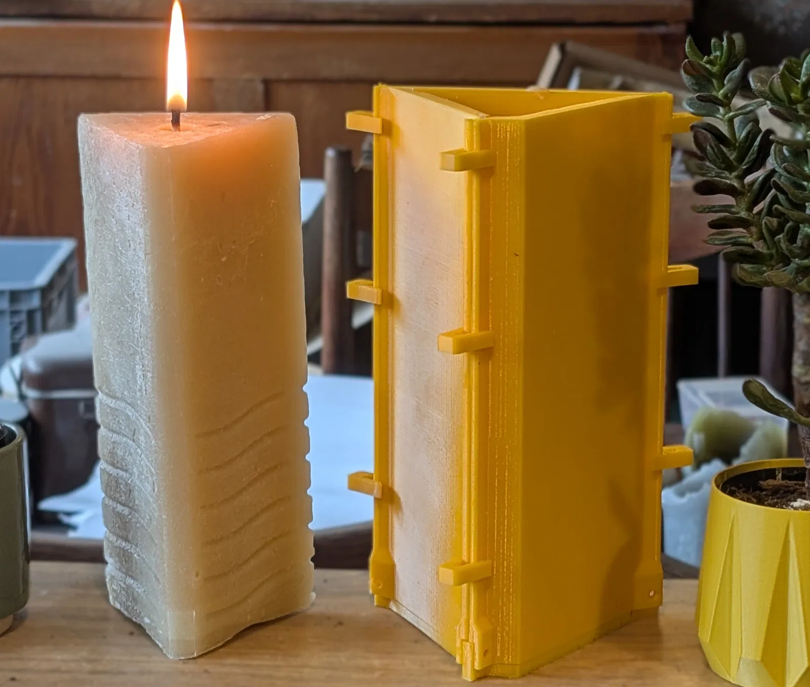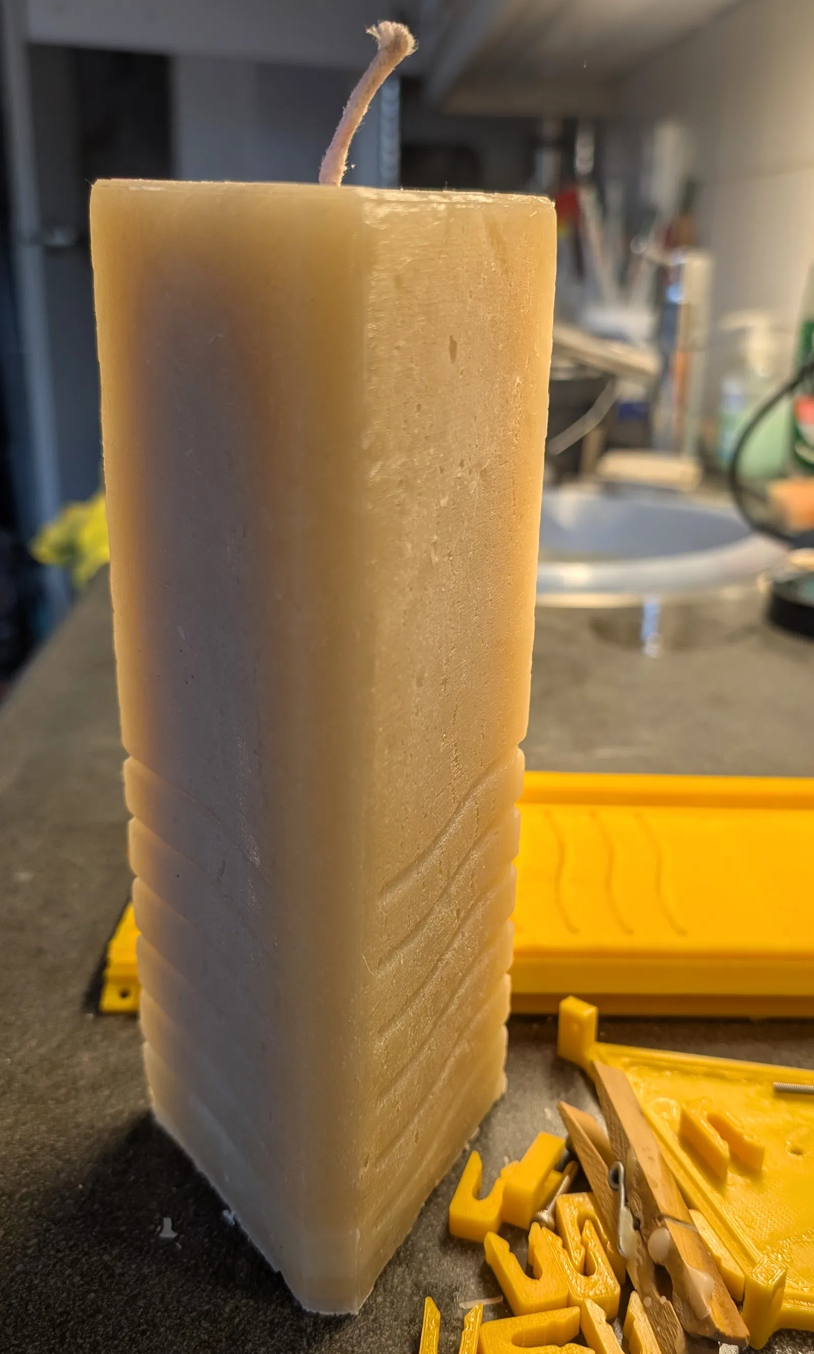 Sáp không dính vào PETG chút nào, tháo ra rất ngon và đường ráp khuôn gần như không thấy. Việc duy nhất mình làm là cắt bấc ở đáy và trên đầu, rồi gọt bớt một chút phần đáy để cây nến đứng thẳng.