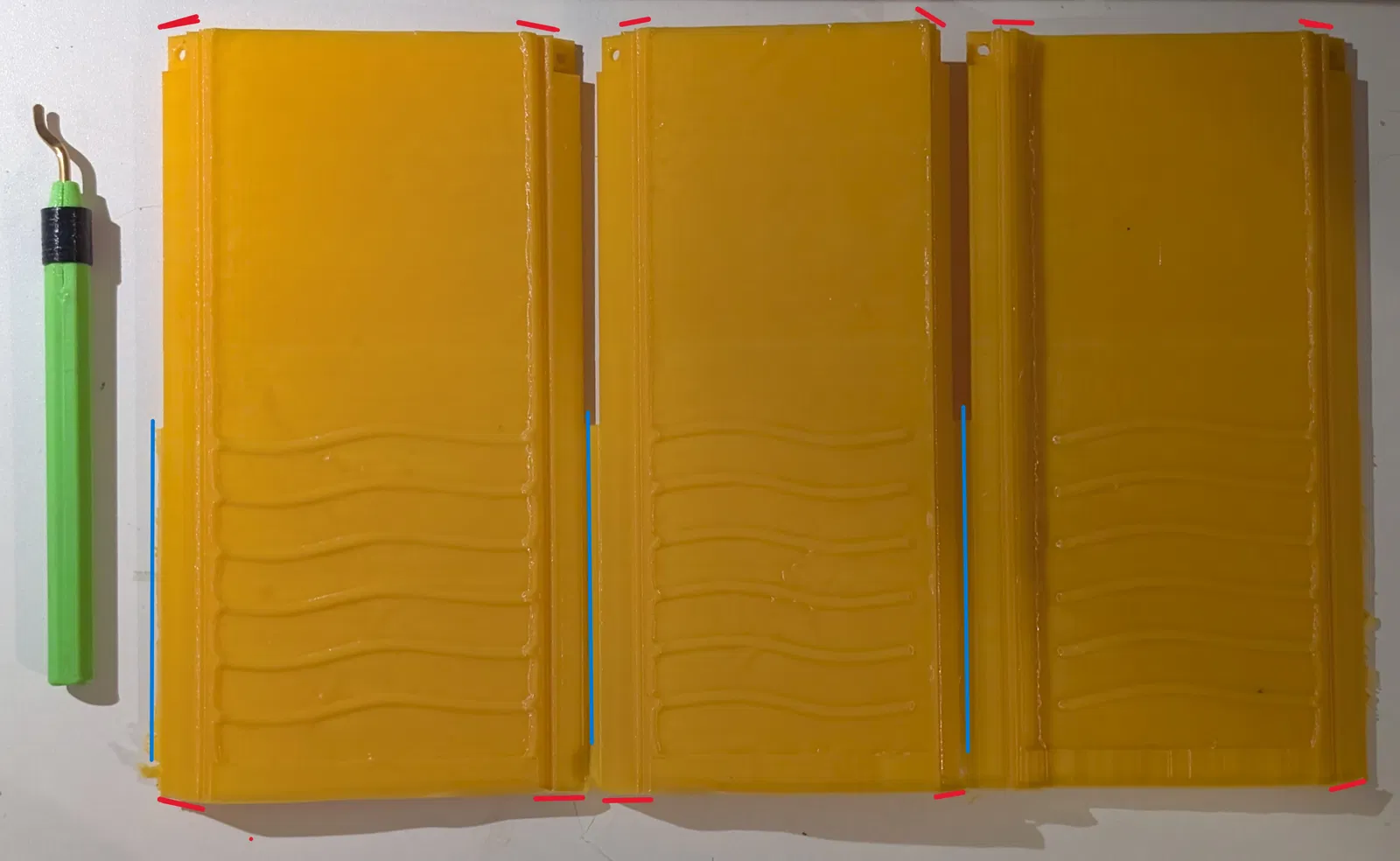Cái deburring tool của mình: dùng để làm sạch các cạnh bên rất ổn 😉. Phần trên và dưới của các bề mặt ráp khớp cần chăm kỹ hơn (hình cuối: đường đỏ); khớp càng khít thì càng hạn chế bị rỉ và giảm công dọn dẹp sau khi đúc.