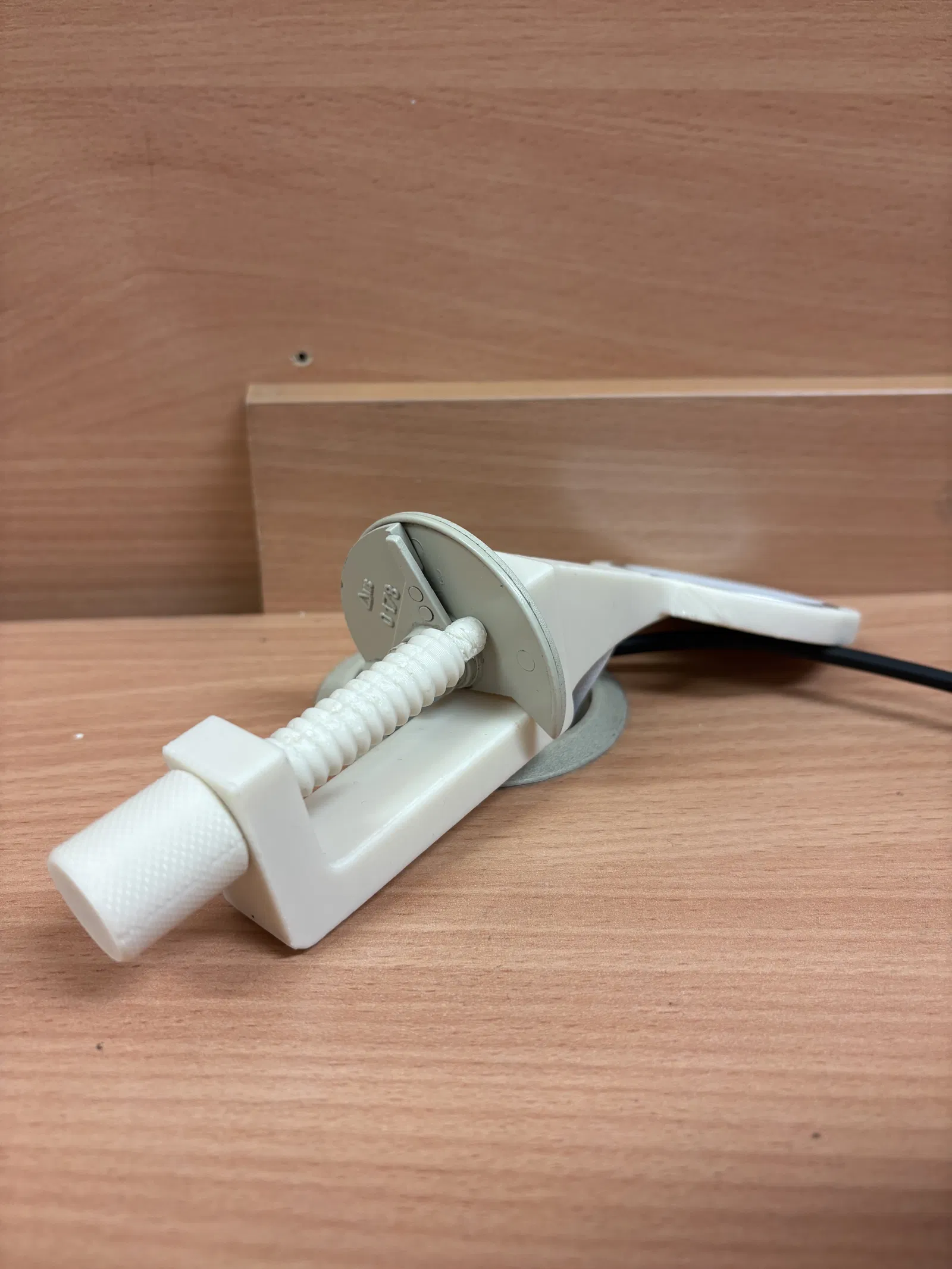 Bạn cần luồn đầu cắm và dây cáp qua phần khoét từ phía trước trước, rồi mới ép bộ sạc vào cho khít. (Ban đầu mình thiết kế phần khoét cho bản sạc dùng USB-C, nhưng chắc cũng vừa với cáp Lightning). Do không gian hơi hạn chế và hướng lắp mình muốn, mình không dùng clamp_protector bản gốc ở đầu ren (xem hình).