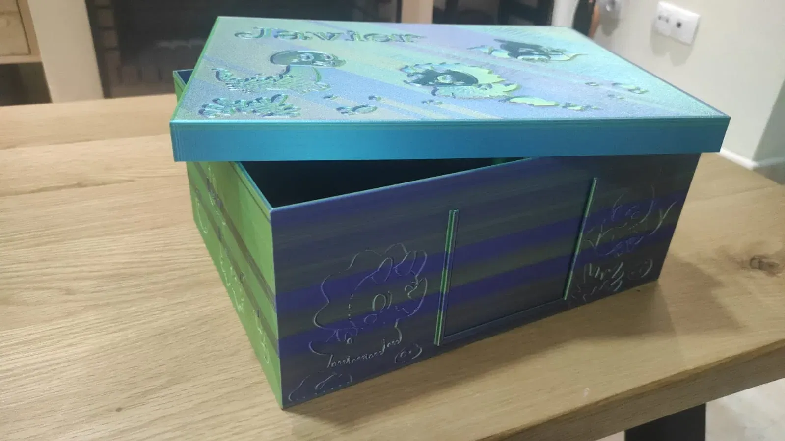 Tôi đã in nó bằng một loại filament ba màu với kết quả không chắc chắn, xin lỗi về điều đó. Trong những bức ảnh, bạn có thể thấy nó với tên của con trai tôi nhưng tôi đã thay đổi thành từ Dinos.