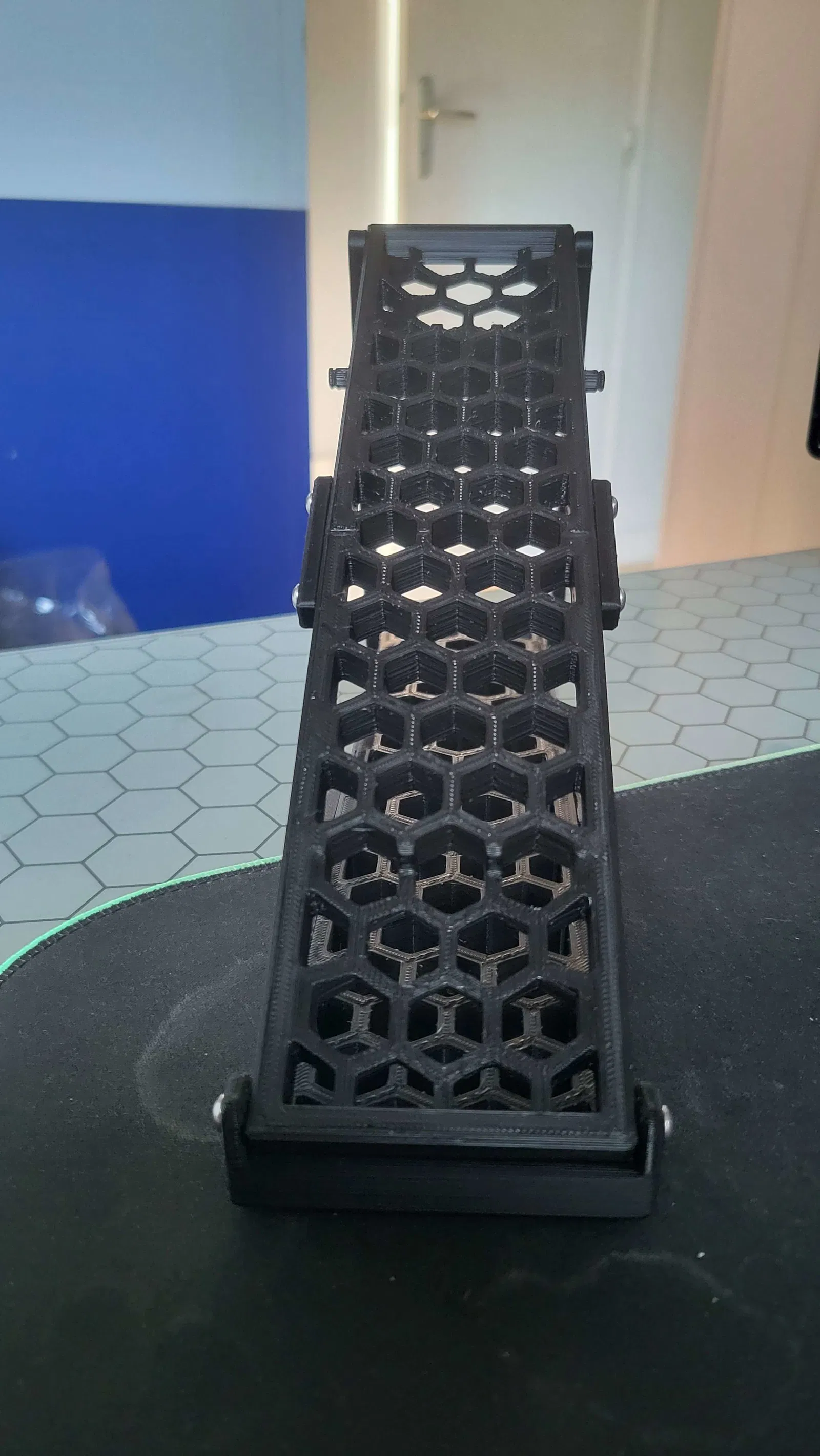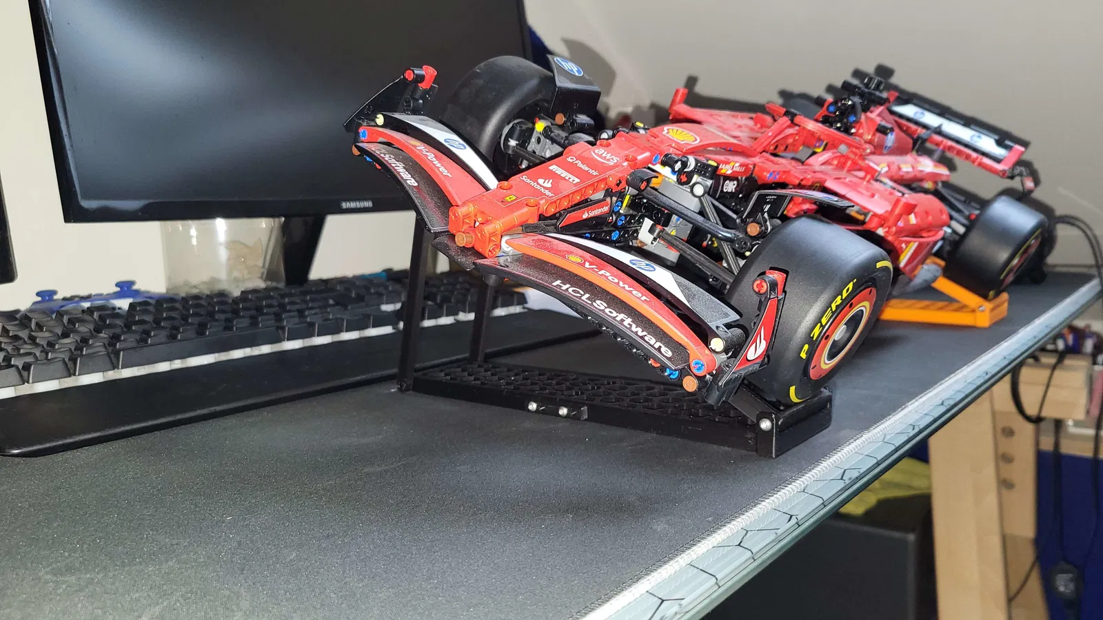 Chân đế/gá trưng bày cho Lego F1 Ferrari set 42207. Kích thước khi gắn xe 250×550×200 mm. In bằng PLA hoặc PETG (ưu tiên PETG), layer height 0.2 mm, không cần support. Lắp bằng insert M3 và vít M3x8.