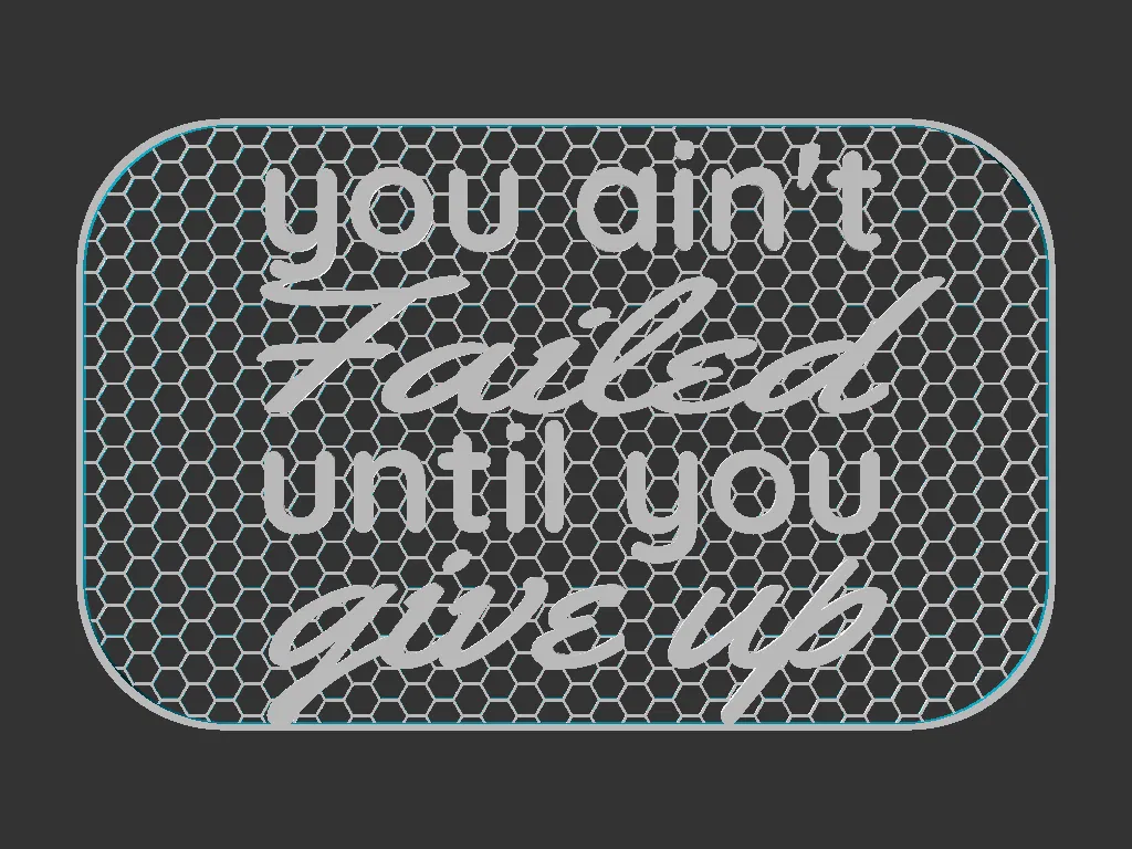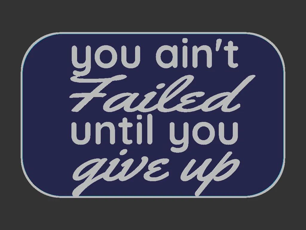 Bảng 100x160mm với câu “You ain’t Failed until you Give up”. Có file Mesh và Solid để dễ in hơn; khuyến nghị chuyển màu sau mức 1mm theo gcode kèm. Tương thích Shadowbox Frames.