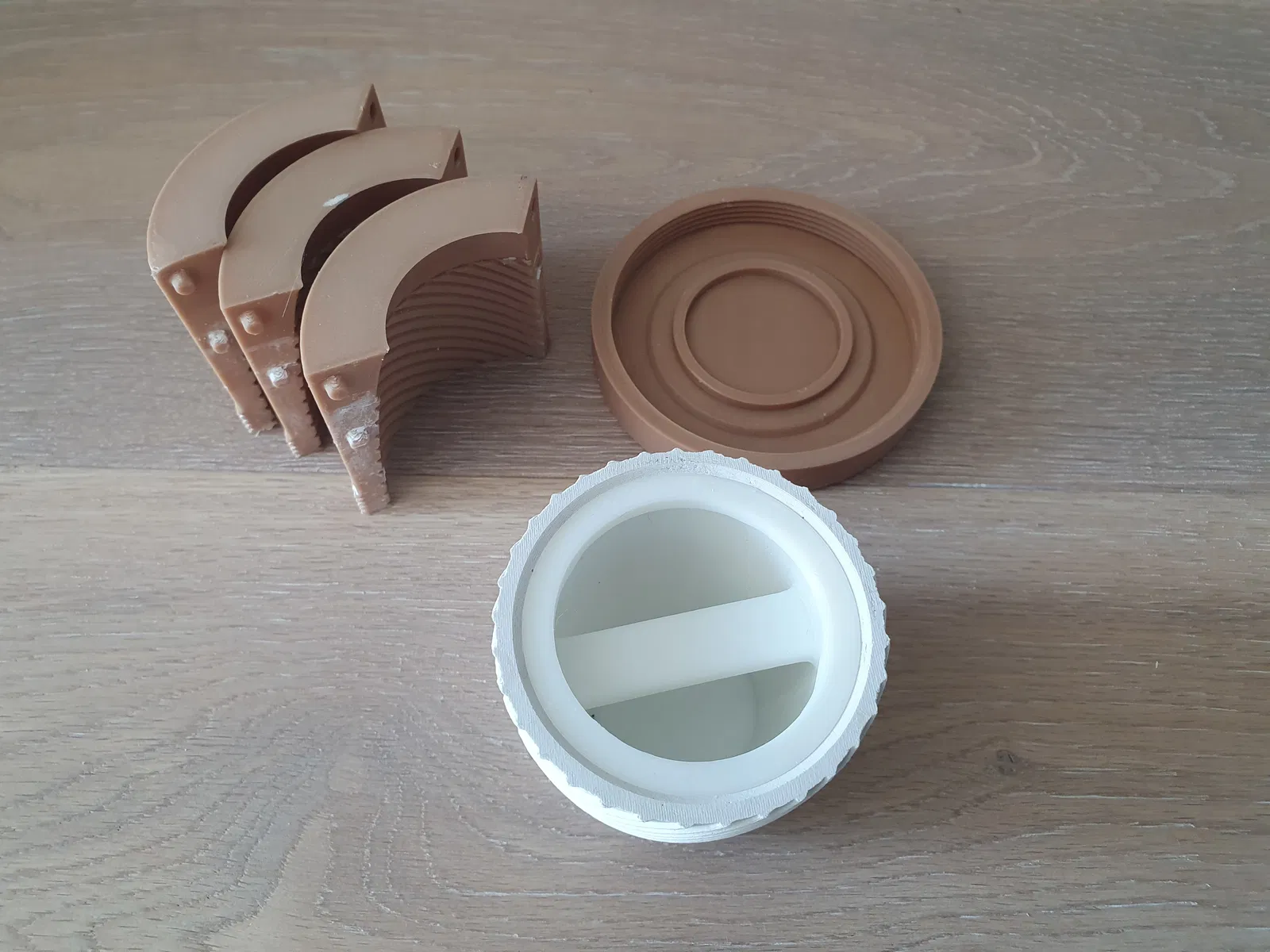 Đây là khuôn chậu cây gồm 5 phần. Có thể tái sử dụng; tới giờ mình đã đúc được 3 cái bằng cùng một bộ khuôn. Bạn có thể dùng bê tông, thạch cao, hoặc vật liệu khác.