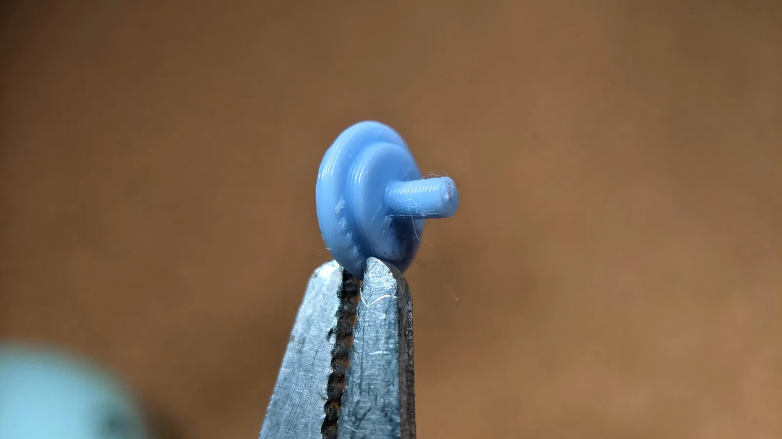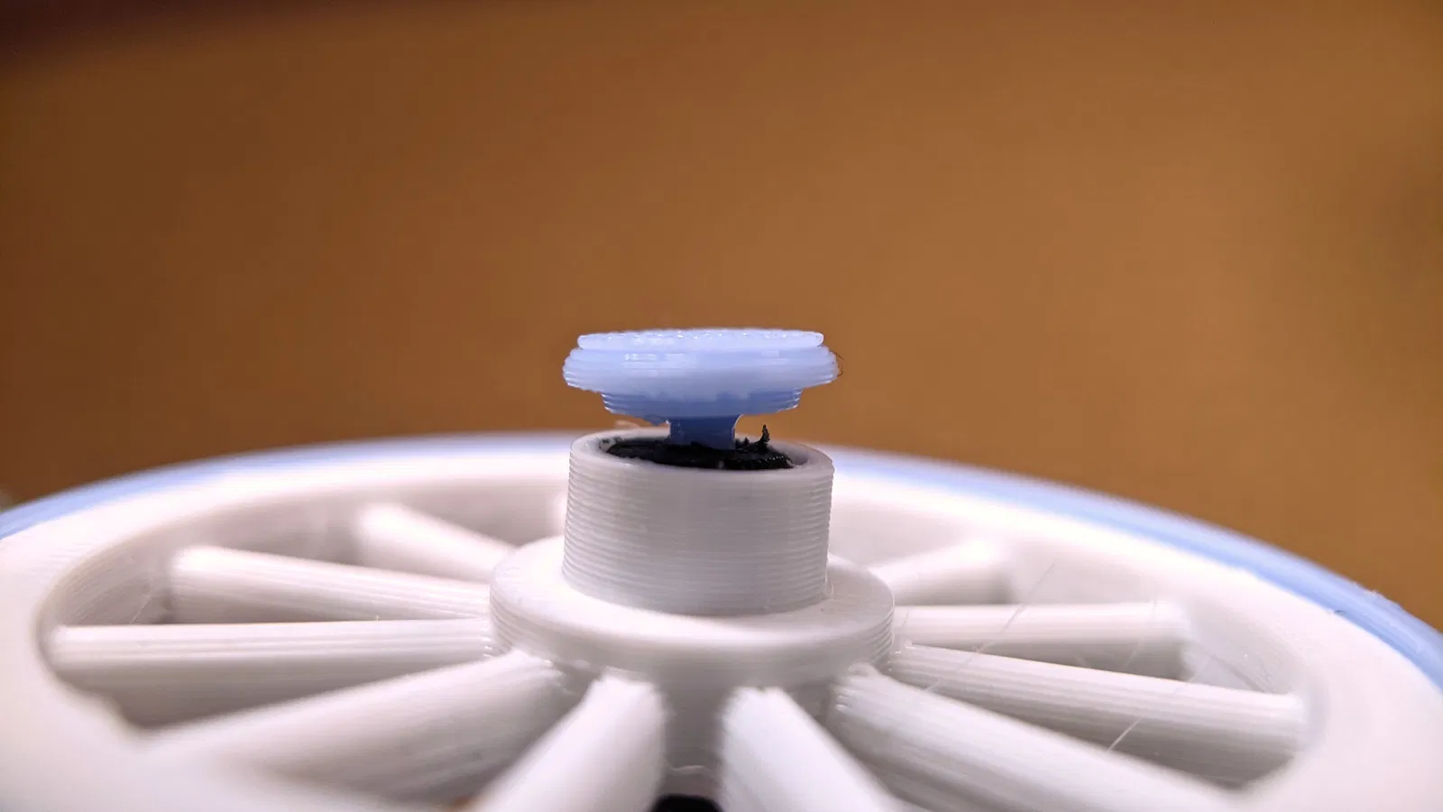 Mình thiết kế mấy nút chặn (plugs) cho bánh xe này để cái xe đẩy có thể di chuyển được. Cần khoan lỗ 2mm trên trục (axis). Nhớ kiểm tra để bánh xe quay mượt. Nếu chưa mượt thì chỉ cần đưa mũi khoan vào và nới rộng lỗ thêm chút. Có thể làm bằng tay, không cần tua vít. Sau đó dán plugs bằng keo siêu dính (superglue).