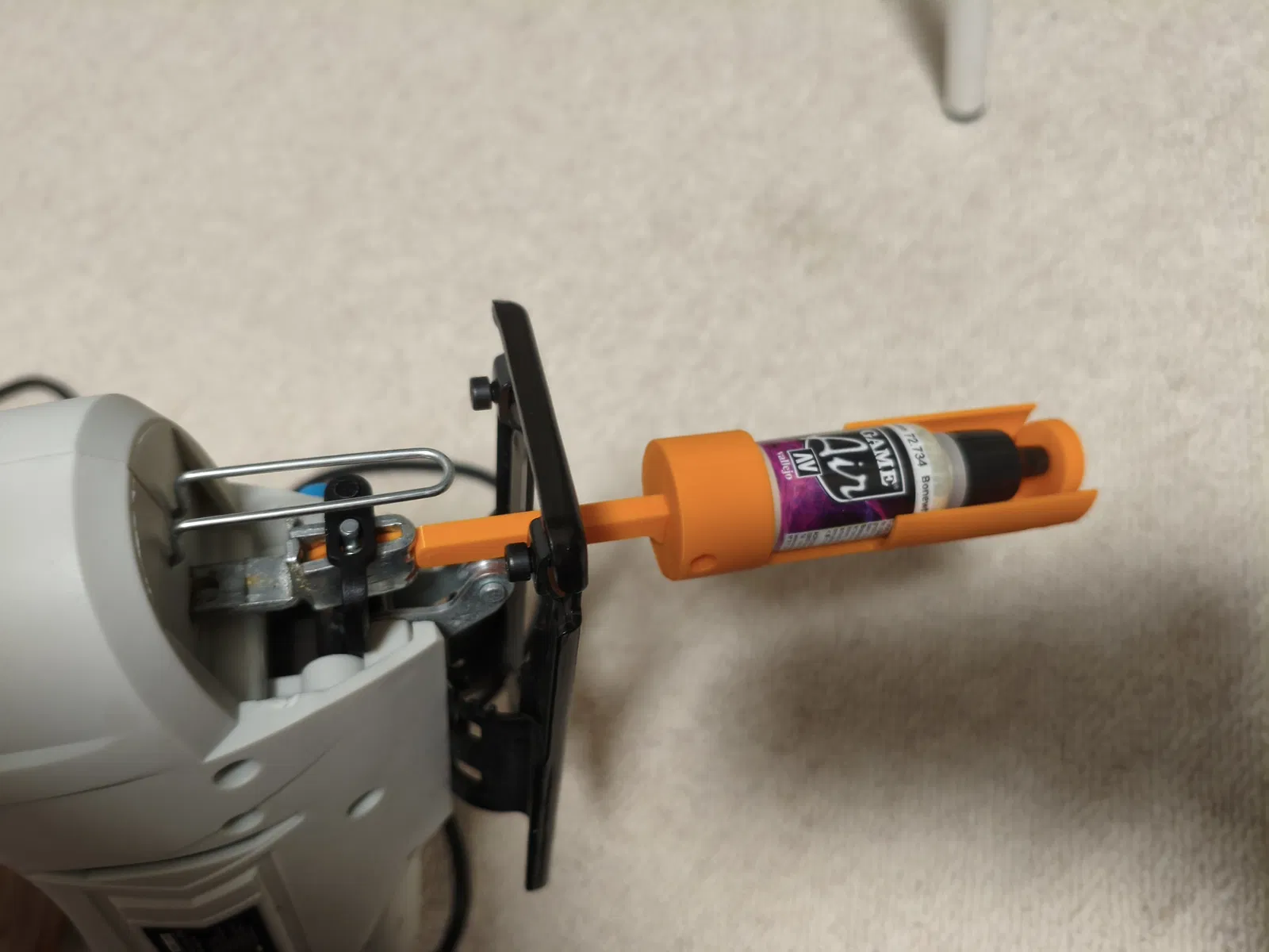Mẫu đầu lắc sơn Vallejo 18ml gắn vào ngàm lưỡi jigsaw chuẩn T-shank, giúp trộn sơn nhanh. Khuyến nghị in bằng vật liệu khác PLA để tránh nóng do ma sát khi chạy. Cần ốc M2.5 và đai ốc.
