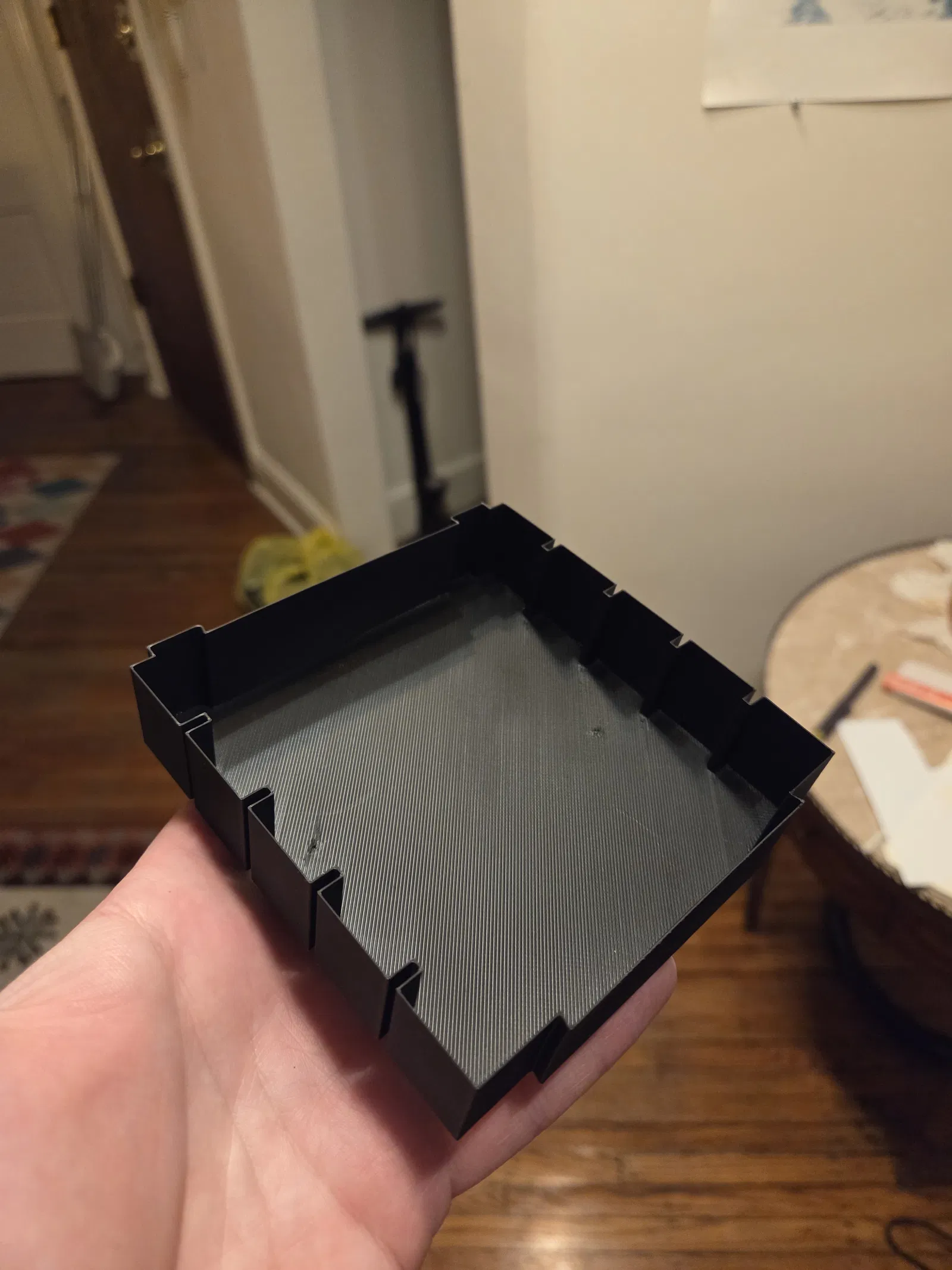 • Dovetail lock: dùng để giữ các khay dính với nhau. Do in vase mode nên phần dovetail hơi yếu; các khóa này có thể cài vào giữa các gân (ribs) của khay để giữ dovetail không bị bẻ tách ra.
