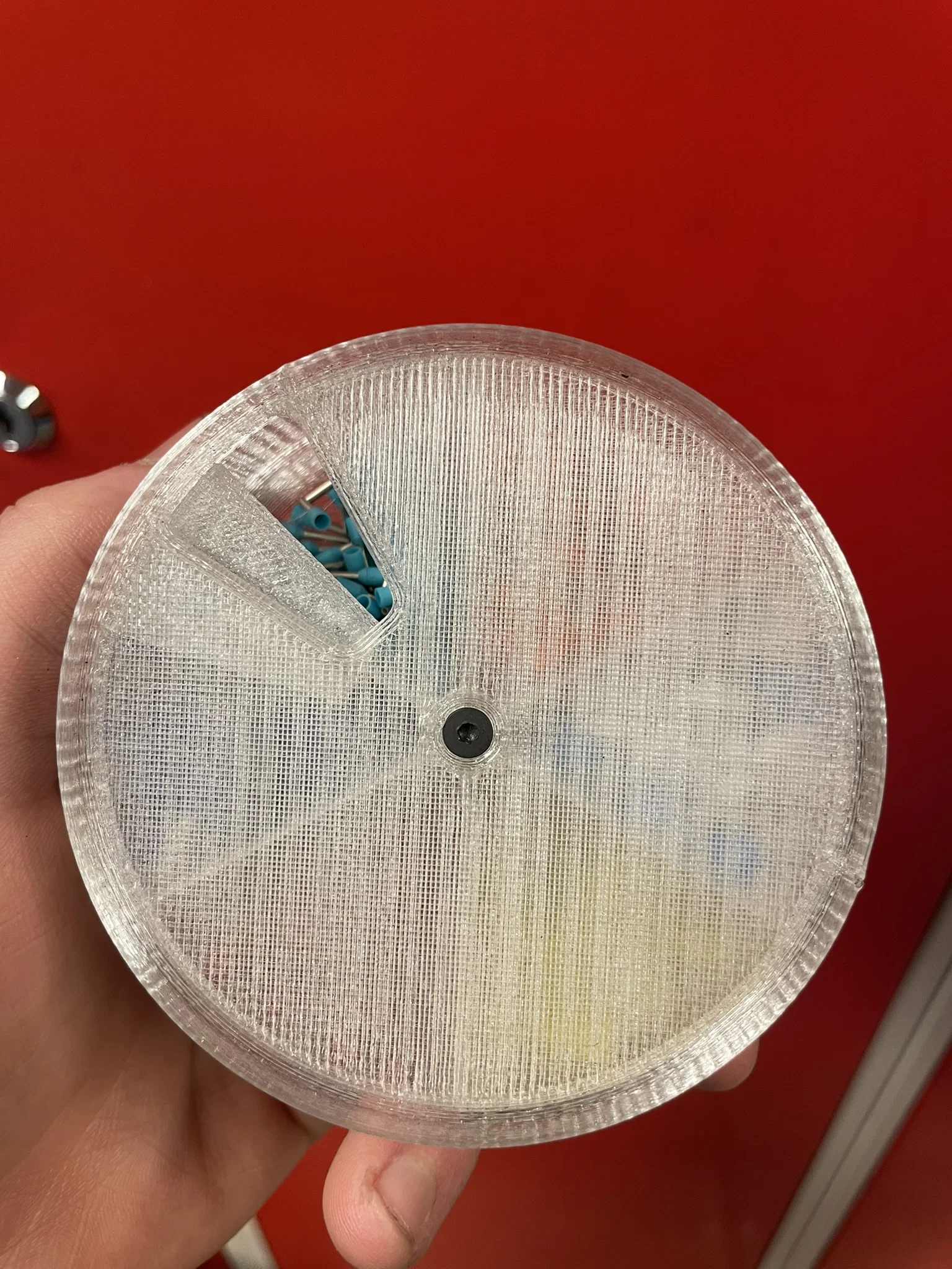 CircleSorter V2 là phiên bản nâng cấp, lắp ráp chỉ cần vít M3x10mm countersunk + đai ốc M3 nylock. In dễ, không cần supports. Phù hợp đựng ferrules, nắp có gờ giữ đồ gọn, nên in filament trong suốt để dễ quan sát.