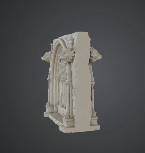 Tấm tường nhà thờ Gothic được điêu khắc tinh xảo với cửa sổ vòm nhọn, tracery cầu kỳ và texture đá khắc sâu. Bóng đổ mạnh, dễ weathering, dùng như mảng tường mô-đun hoặc trưng bày cho bối cảnh dark fantasy.