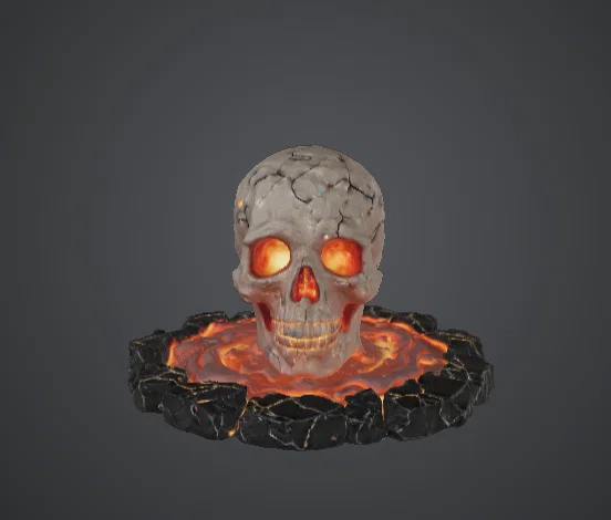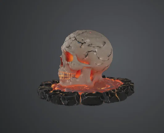 Bản sculpt này kết hợp chi tiết xương sắc nét với texture dung nham chảy mềm mại, tạo nên tương phản mạnh giữa sự mục rữa hữu cơ và sức nóng của nguyên tố. Phần đế dung nham hình tròn tạo điểm nhìn tự nhiên, rất hợp để làm địa điểm nghi lễ, mốc chiến trường bị nguyền rủa, hoặc cổng triệu hồi ma thuật.