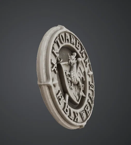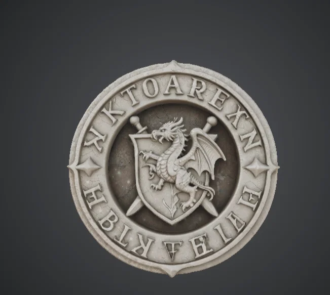 Con rồng được điêu khắc đứng hiên ngang trên mặt khiên, dang cánh, đuôi cuộn lại, tạo điểm nhấn trung tâm chắc chắn với độ sâu các lớp rõ nét. Chữ khắc ở vòng ngoài cùng các điểm nhấn ngôi sao trang trí làm tăng chất “crest” truyền thống, rất hợp để sơn kiểu đá, tạo hiệu ứng kim loại, hoặc phong cách đồng cổ (aged bronze).