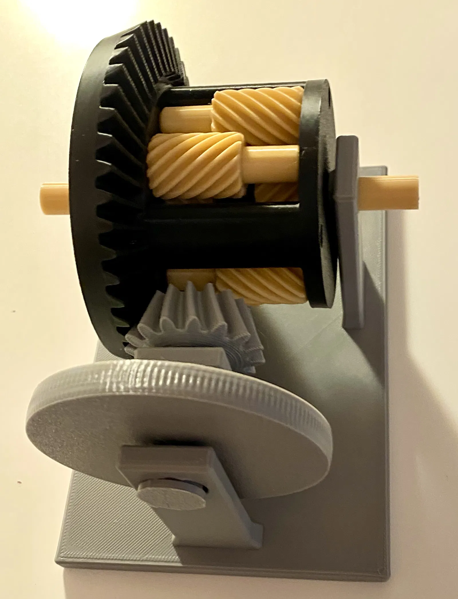 Phần đế có thể dùng mà không cần dán keo. Gắn axle như trong hình và dùng một đoạn filament để khóa main drive gear vào axle. Cách này sẽ “cố định vĩnh viễn” main drive gear. Có thể tháo differential khỏi đế bằng cách nới lỏng right support.