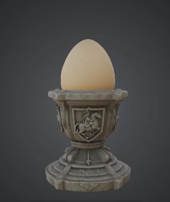 Bệ trưng bày trứng rồng phong cách fantasy như một bệ thờ cổ, có khiên huy hiệu chạm khắc, lớp chi tiết giả đá và bệ nền bậc thang vững chắc. Phần chén rộng ôm trứng hoặc vật hình cầu, rất hợp để sơn giả đá, marble hay metallic.