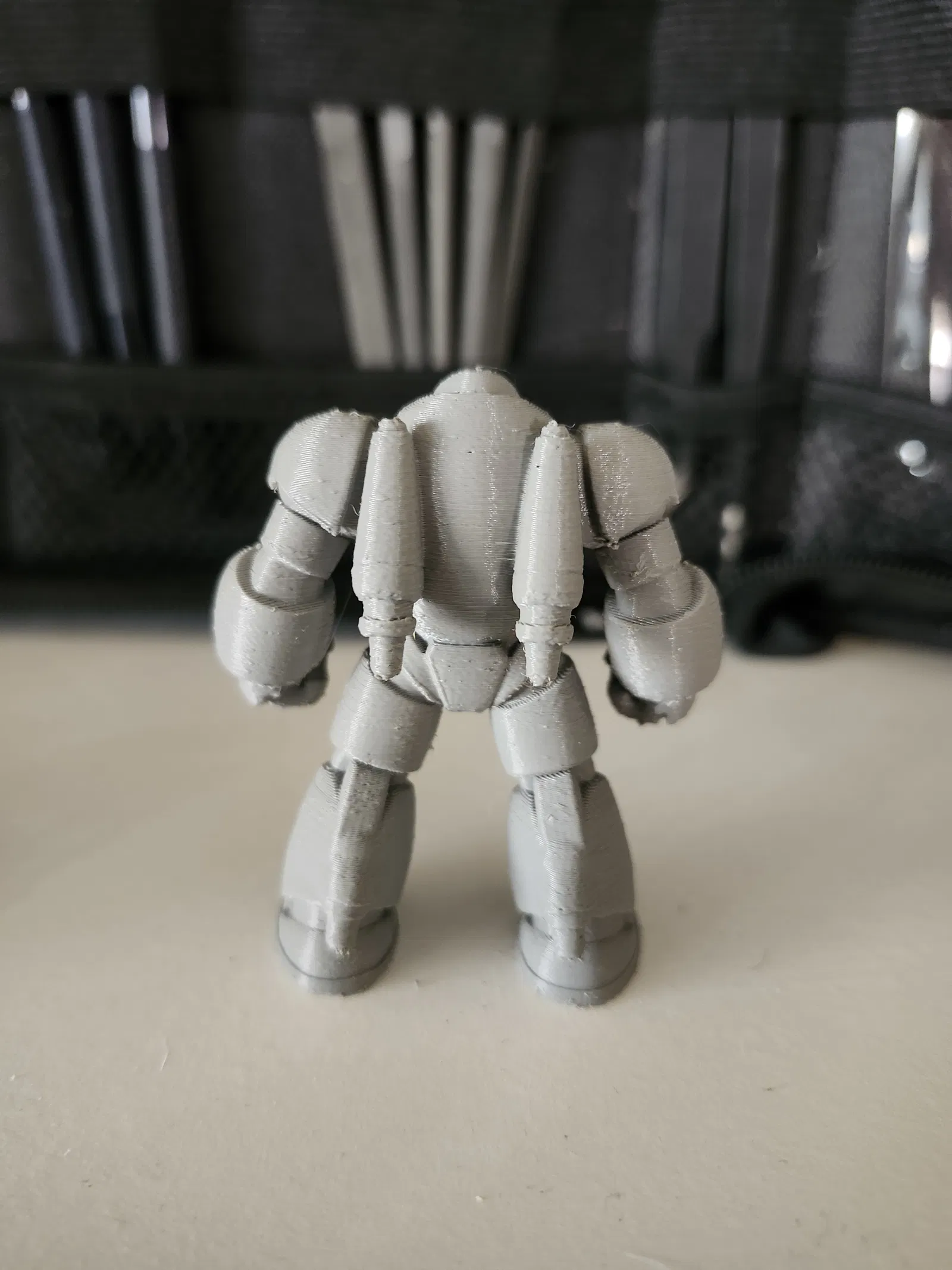 Mẫu này đánh dấu một cột mốc lớn trong hành trình “học điêu khắc” của mình. Mình thiết kế để form dày, bền, và dễ sơn. Model có giáp nặng, bo tròn, thrusters gắn sau lưng, và chiếc loa ngực đặc trưng.