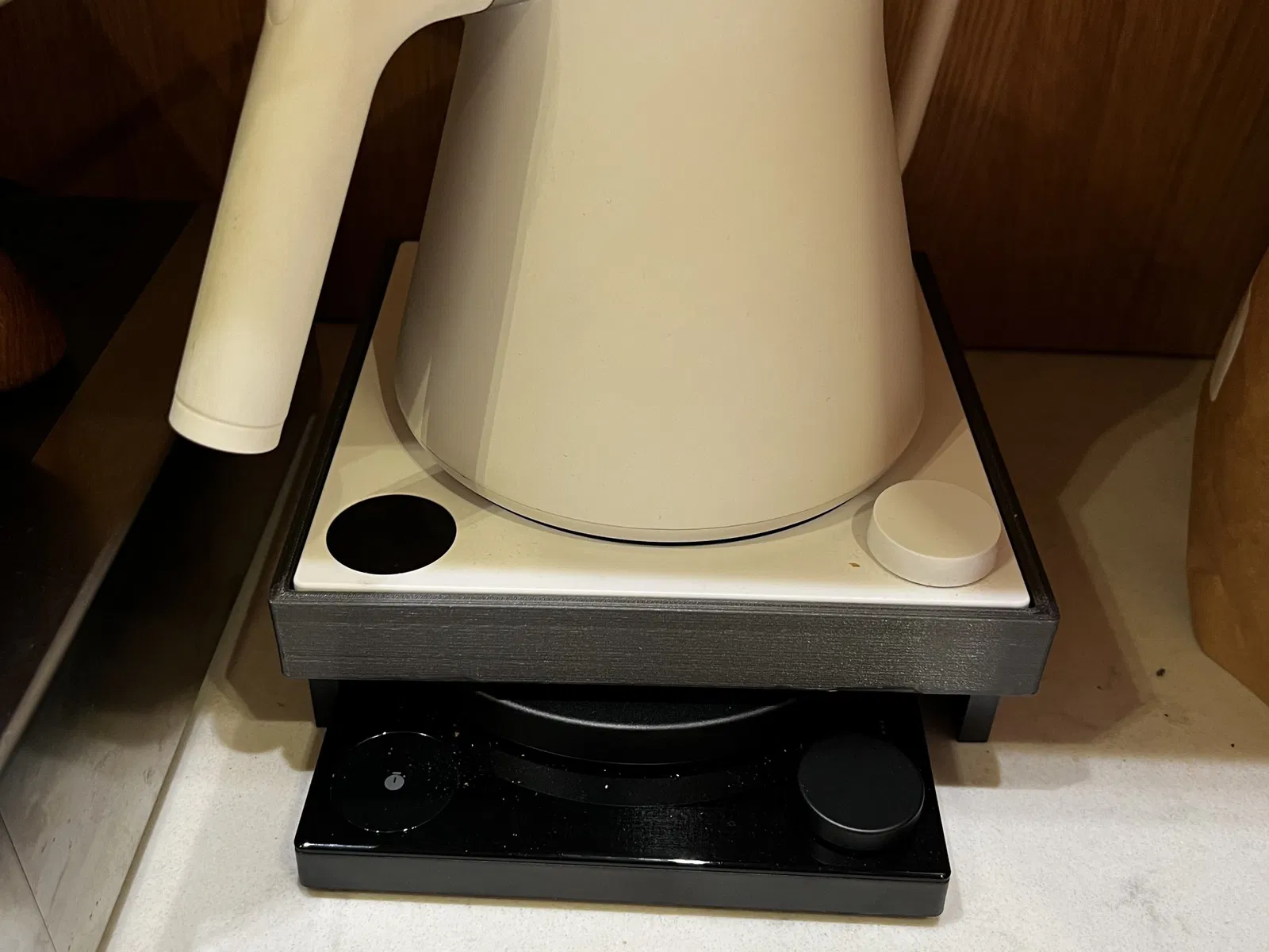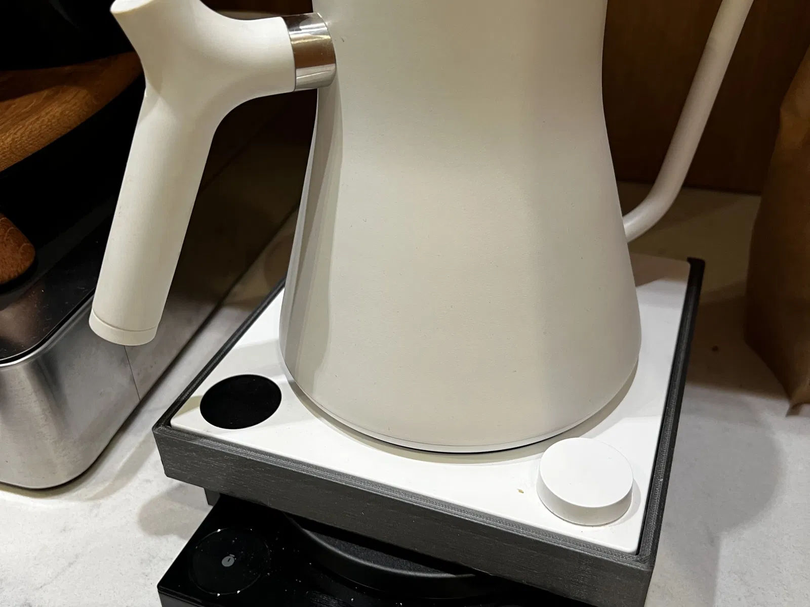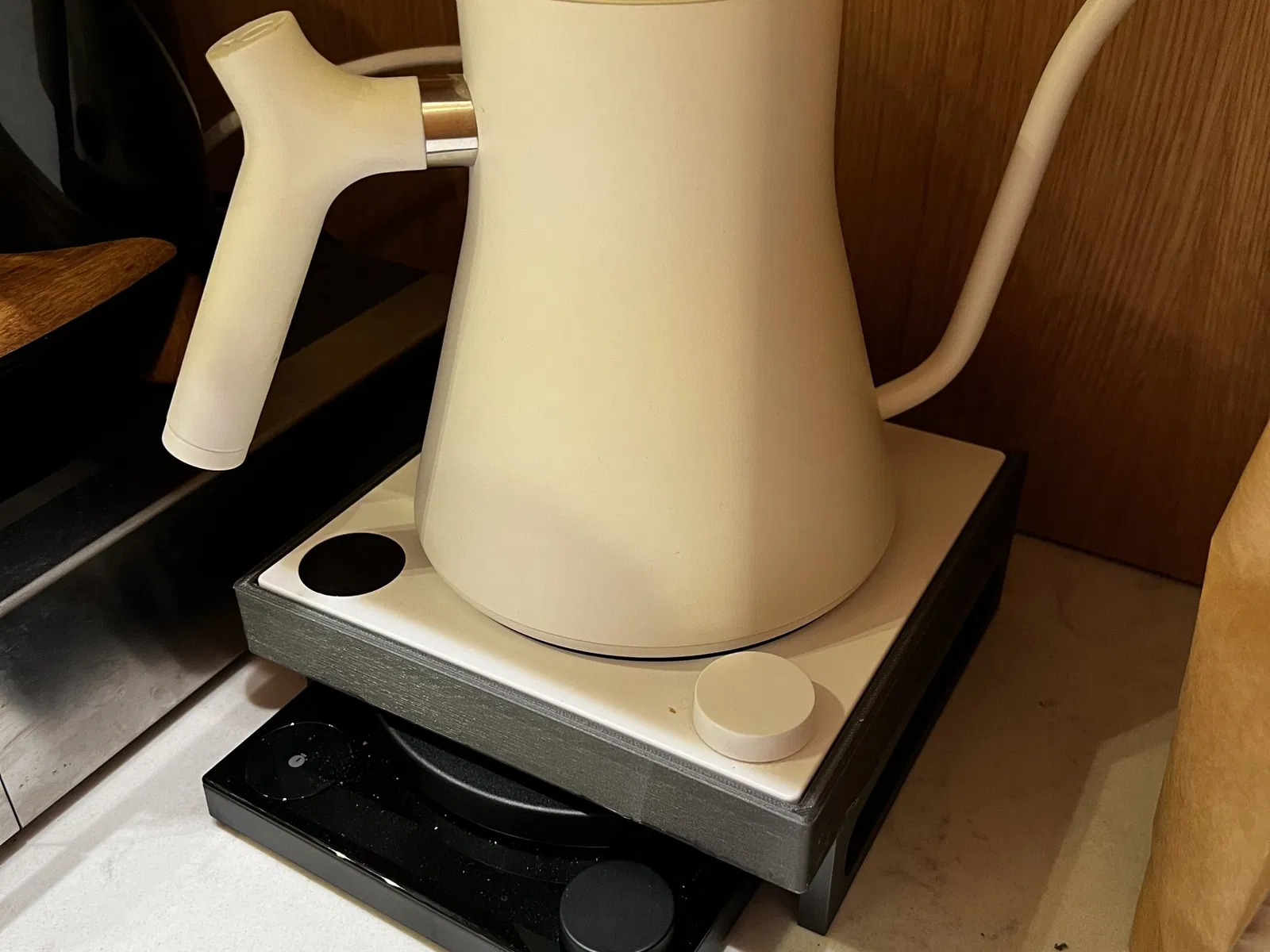 Tôi đã làm kệ này để cân cà phê Fellow Tally vừa dưới ấm nước của tôi.