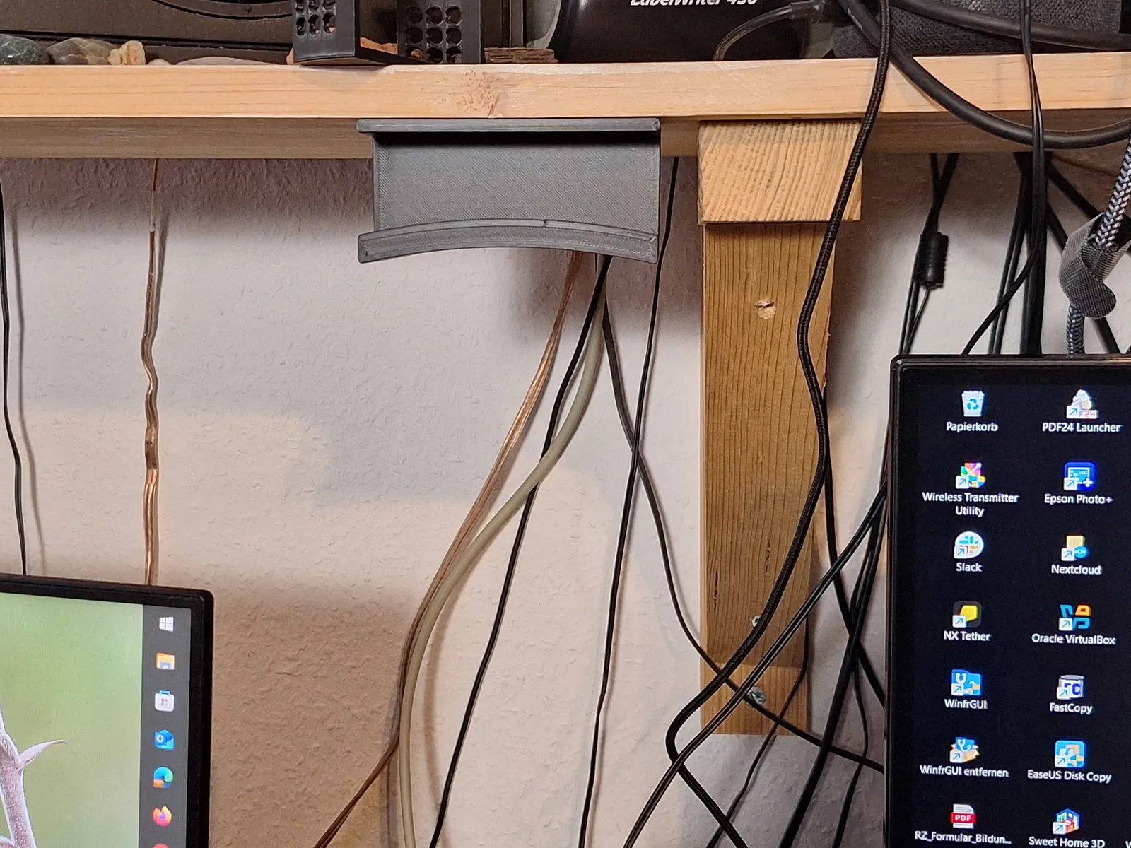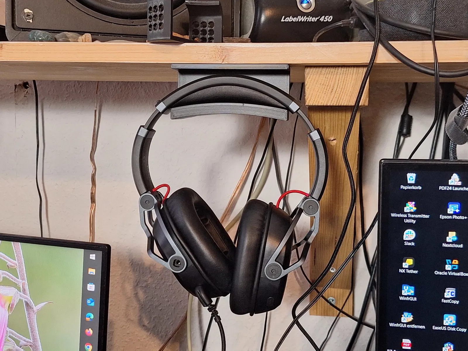 Móc treo tai nghe Teufel CAGE có thể bắt từ phía dưới lên kệ bằng vít gỗ 4mm. Mình in bằng PLA với 4 perimeters, dùng chắc chắn và cũng hợp cho nhiều mẫu headphone/headset khác.