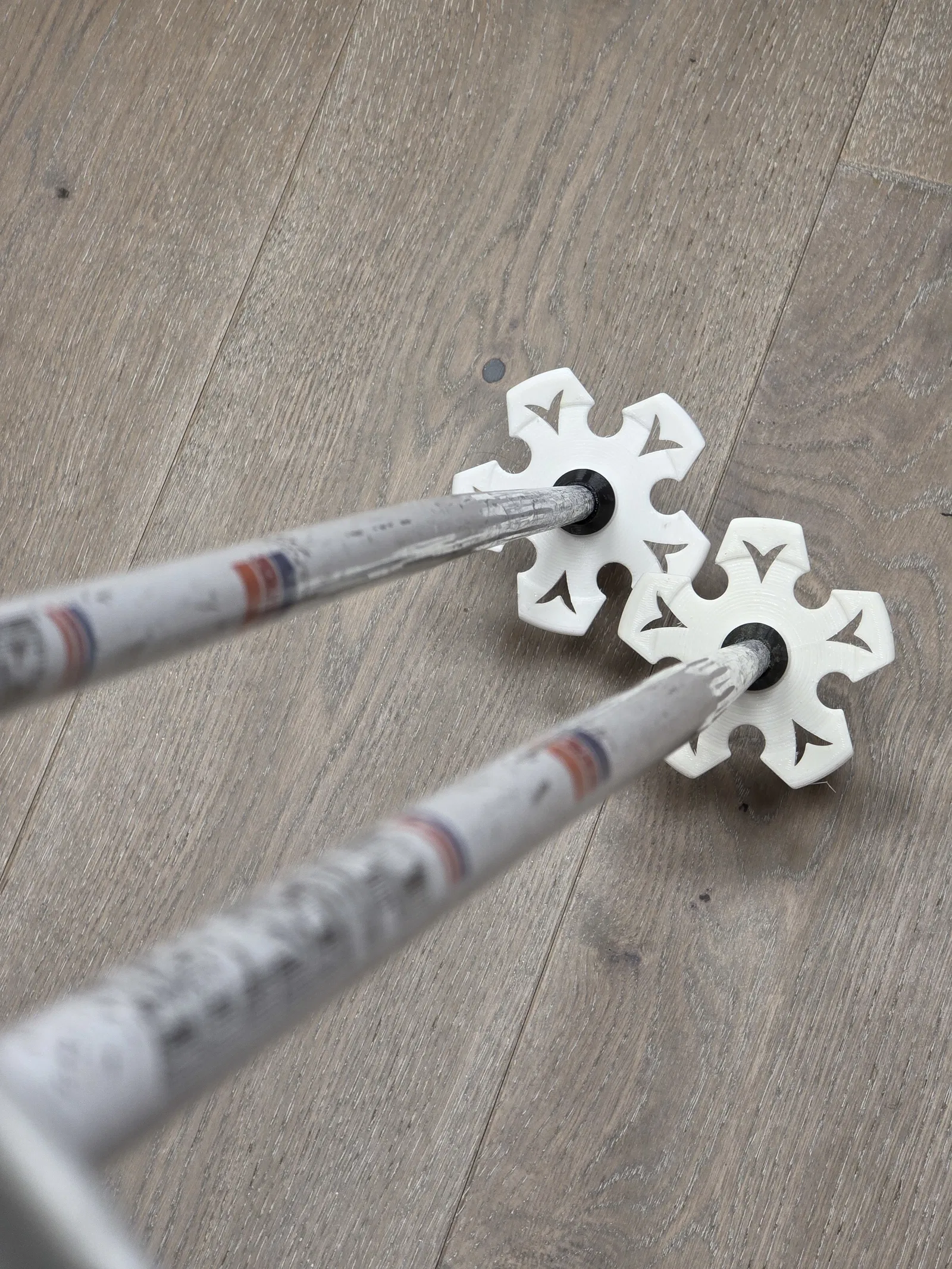 Mấy cái basket zin trên cặp gậy ski cũ của mình qua năm tháng bị trầy xước, rách te tua. Vài năm trước, khi một cái basket bị rụng mất 3 trong 5 cái “cánh”, mình quyết định làm lại cái mới trong lúc vẫn còn giữ được đồ zin để làm mẫu. Mình đã dùng mấy cái basket này để trượt từ mùa đông 2022/2023 tới giờ.