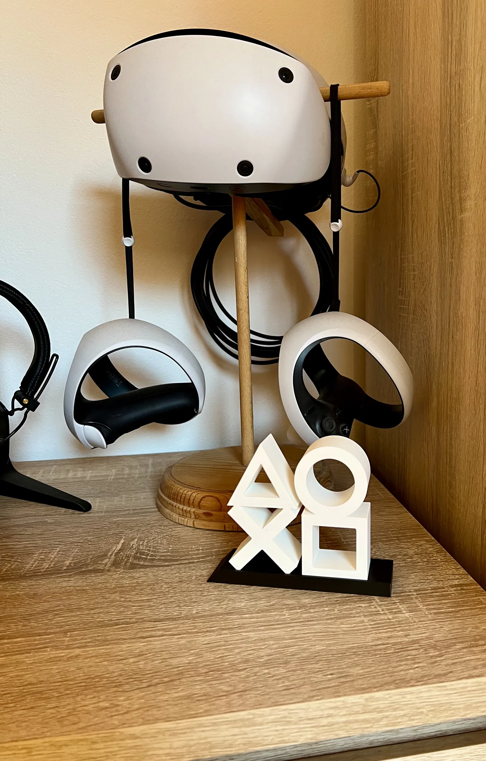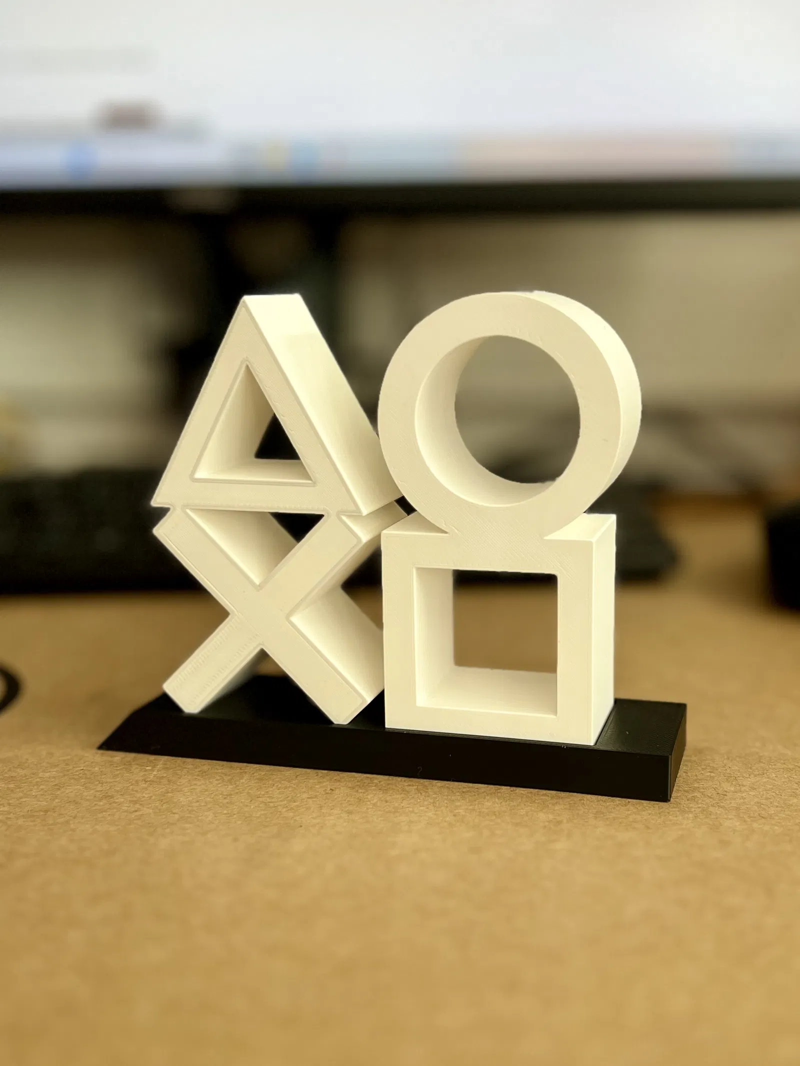 Kệ trưng bày tối giản theo biểu tượng nút tay cầm PlayStation. Gồm 3 phần tách rời để dễ in: 2 cụm biểu tượng và 1 đế có rãnh/khe gài giúp canh chuẩn, đứng vững. Phù hợp decor kệ/desk gaming.